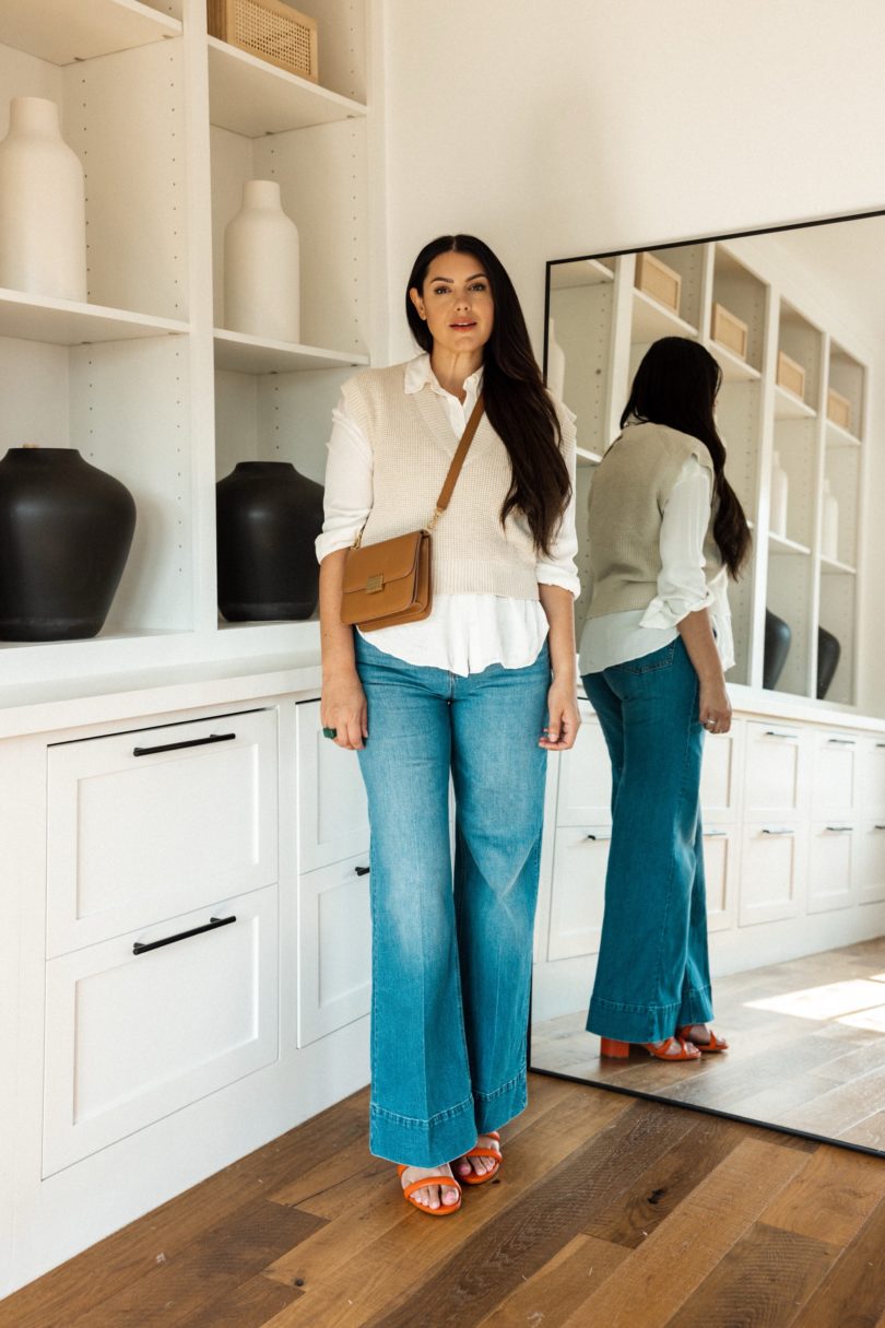 Technically yes this is a sweater and I’m a sweater, so this seems like a stupid idea for August. However, I kept in mind that some of you don’t live in the south and you go to an office, so I thought this was such a perfect office addition for you. Plus I just love it this vest. Any excuse to layer is my favorite. I love love how I placed it over this dress, it looks like it was meant to be, like it’s one piece. Layering this vest over a silk top is a no-brainer of course and it changes with each look.