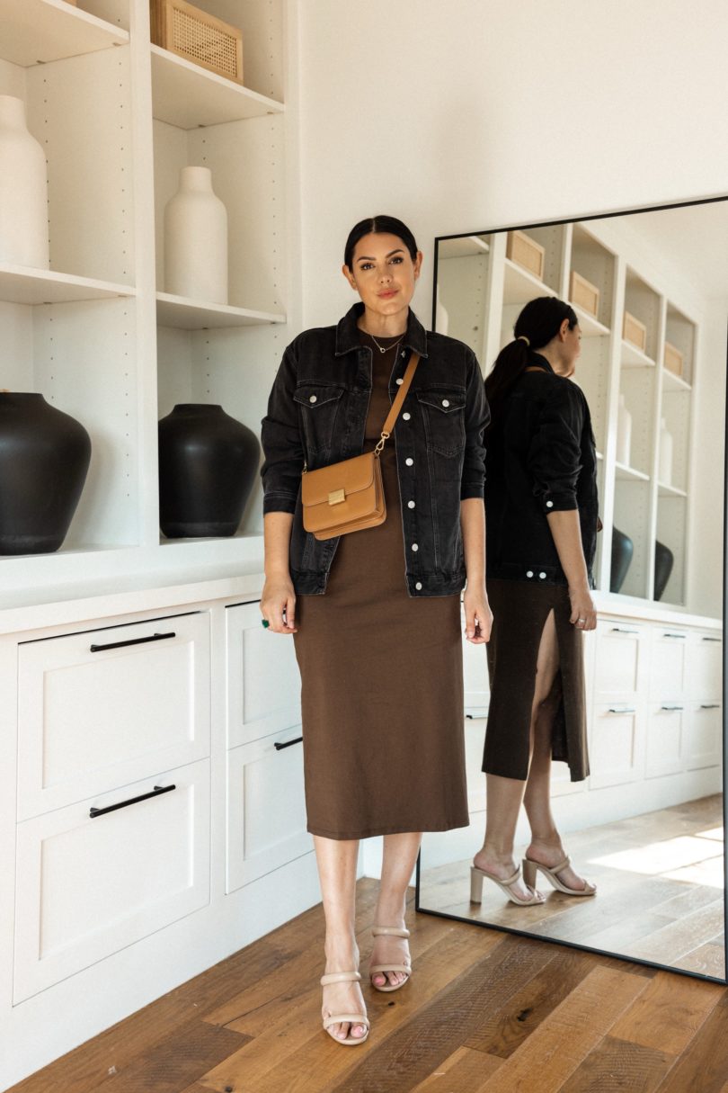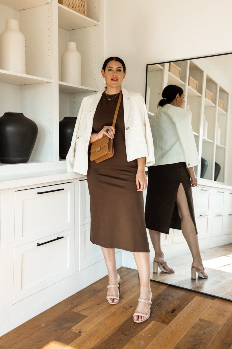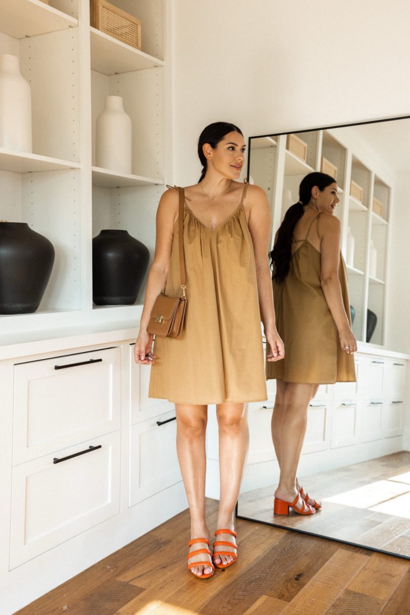 With summer silhouettes and lightweight fabrics, I wanted to bring in autumnal colors to show that you can dress for fall even if it feels like summer outside. Changing the color palette of your summer pieces creates an seamless transition into fall. This brown t-shirt dress I featured in another capsule as well so you can grab some more outfit ideas as well! Find it here!