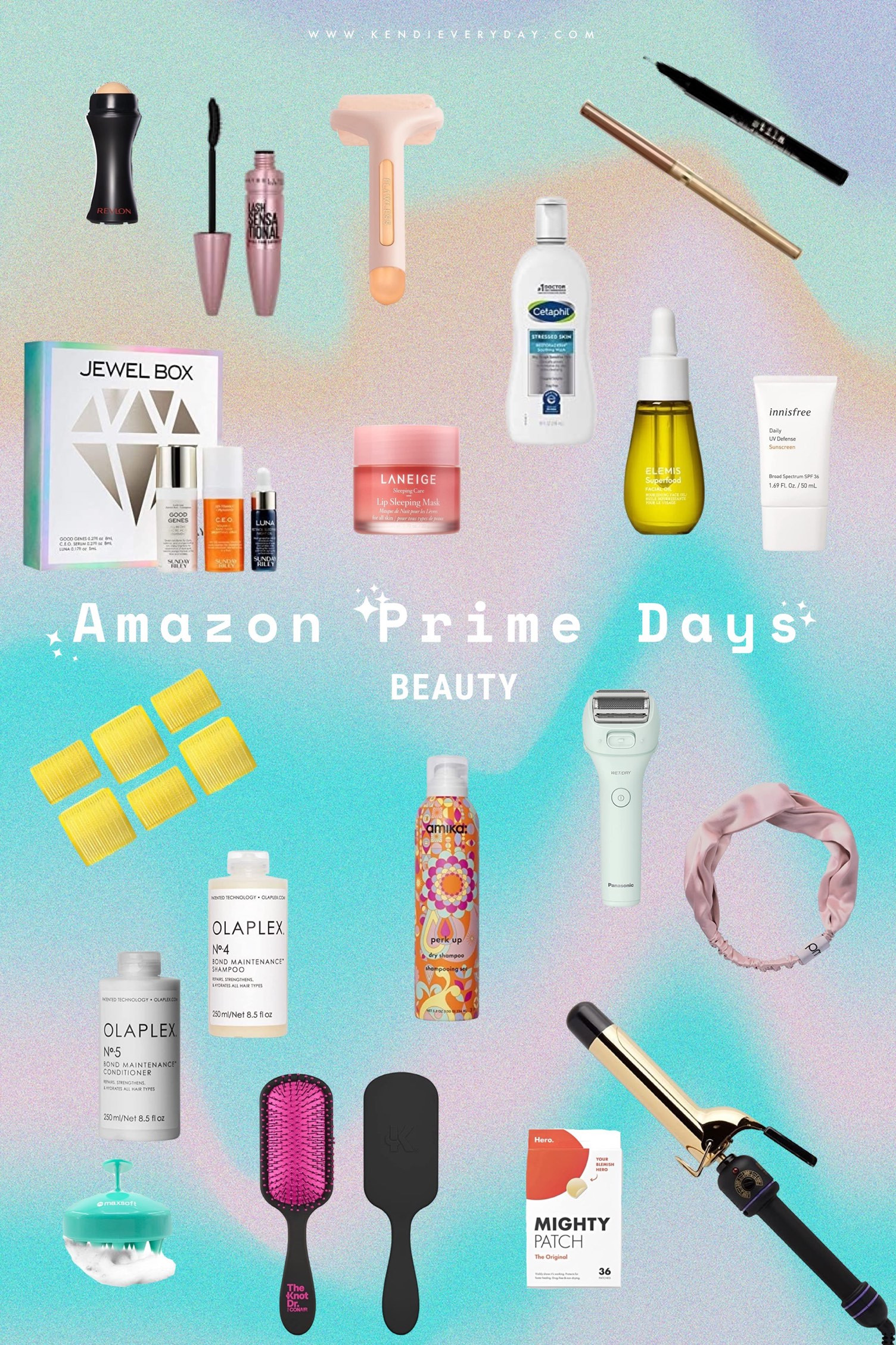 Revlon Face Roller / Maybelline Lash Sensational Washable Mascara / Finishing Touch Flawless Facial Massage Ice Roller / L’Oréal Paris Colour Riche Lip Liner / Stila Stay All Day Eye Liner / Cetaphil Restoraderm Soothing Wash / Sunday Riley Jewel Box Kit / Laneige Lip Sleeping Mask / Elemis Superfood Facial Oil / innisfree Daily UV SPF Sunscreen / Drybar High Tops Self-Grip Rollers / Amika Dry Shampoo / Panasonic Close Curves Electric Razor / PMD silversilk Headband / Olaplex No. 4 Bond Maintenance Shampoo / Olaplex No.5 Bond Maintenance Conditioner / Maxsoft Hair Scalp Massager / Conair The Knot Dr. Brush / Mighty Patch Original Pimple Patch / Hot Tools Curling Iron