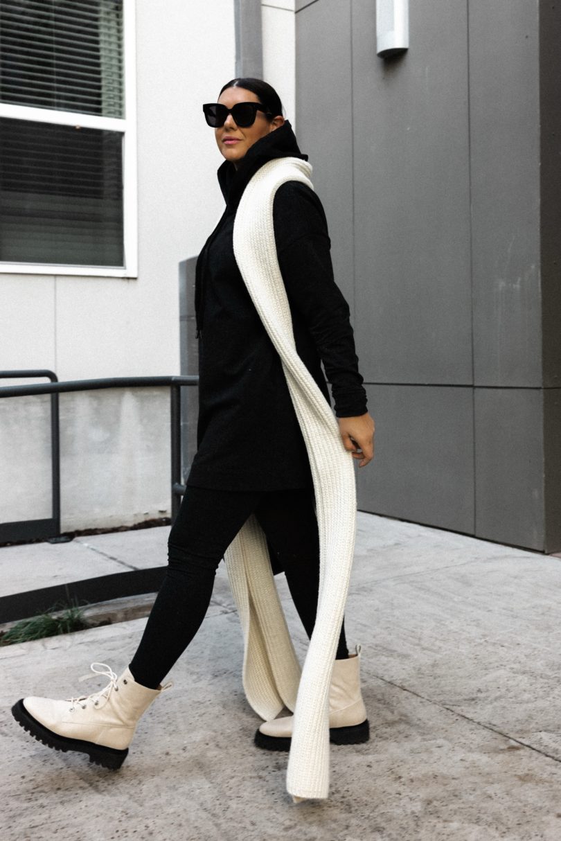 This hoodie dress is gorgeous and so luxe. It’s from a luxury brand called Peruvian Connection, definitely check it out if you love artisan made and natural fabrics! I’ve also linked another look for less as well. (Find an alternate one from Nordstrom here!) However this scarf is a one and only. It’s soft, and the length — THE LENGTH IS EVERYTHING. Find this scarf here.
