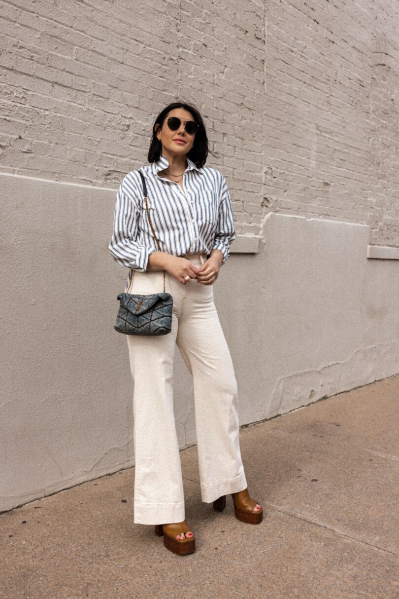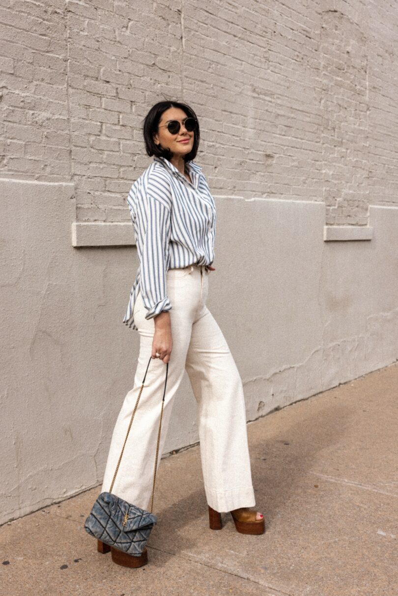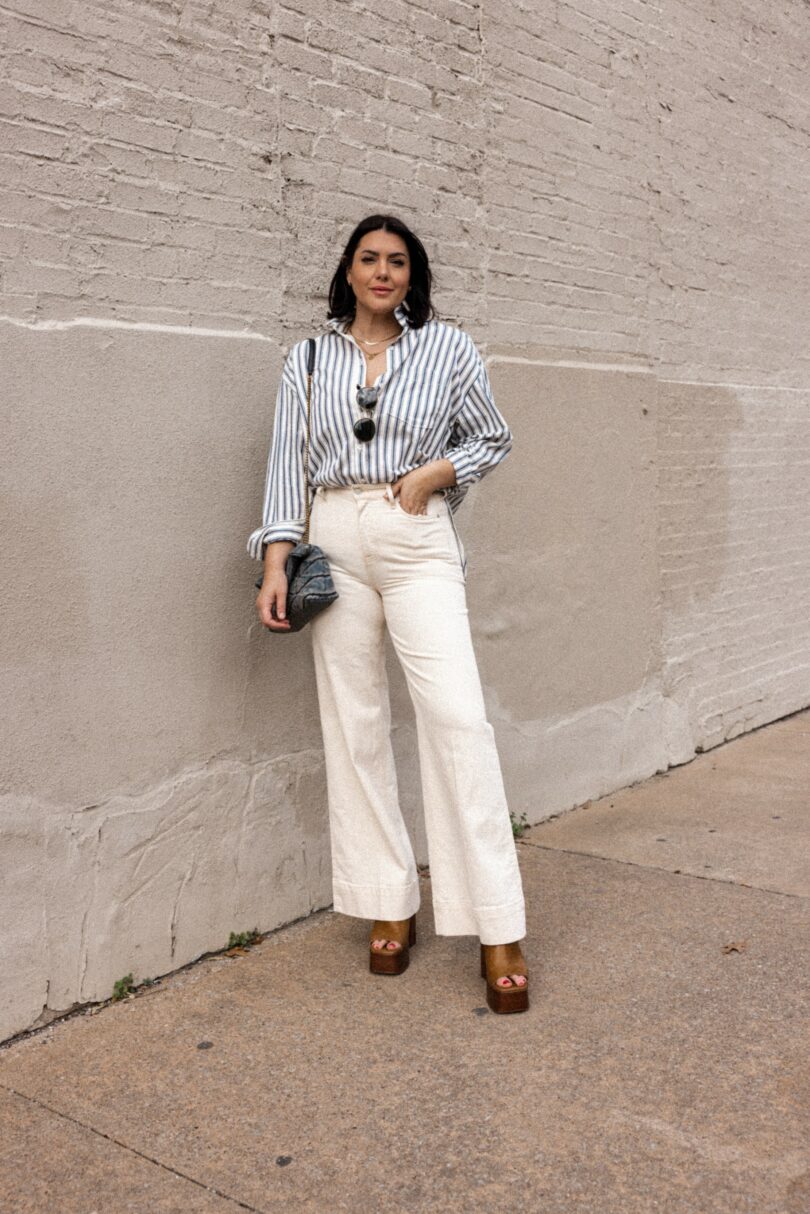 So feel confident saying that I think it’s high time to give your wardrobe an upgrade with some stylish and modern white wide leg denim. If your “mom jeans” have seen better days or you’re just in need of something comfy yet chic, then this trend is for you. For us millennials, any outing that actively involves stepping away from sweatpants, the outfit better be cute, you know? A pair of wide leg denim is the perfect option and honestly? Preferably white or cream. The light hue will go well into spring with you as well. With a timeless silhouette and plenty of styling possibilities plus laid-back comfort – there’s not much more you could want in a pair of pants. Maybe a few $20s tucked in the back pockets but I doubt that J.Crew will do that for you.