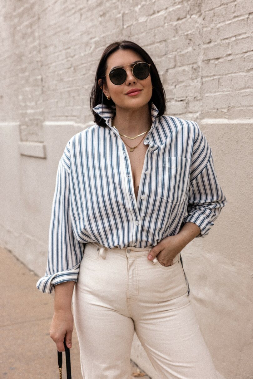 My top is literally the most perfect button down from Anthropologie. It’s oversized and so soft but keeps it’s shape pretty well. I am in the medium, you can find it under $100 here!