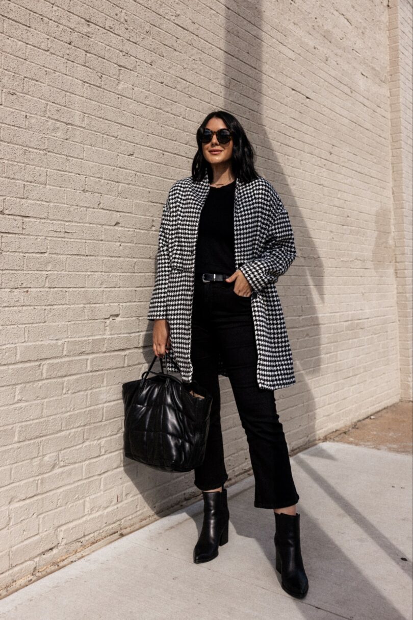 I’ve worn my fair share of statement jackets, coats, and well whatever they are calling this one — a coat cardigan on this blog. Look, I’ve done it all but my absolute go-to outfit with a statement coat or jacket is an all black base. This works especially well for right now because layering is necessary (so I can toss this jacket off when it gets warm in the afternoon!) I have a few more examples of how I’ve worn statement coats below, but I”m telling you — black jeans or pants + a black top is the chicest look around.