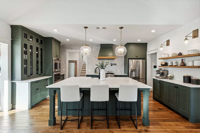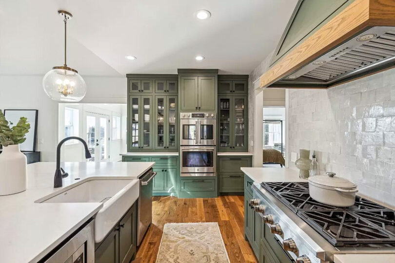 Kitchen cabinet paint: SW Rosemary | Pendant Lights | Backsplash Tile