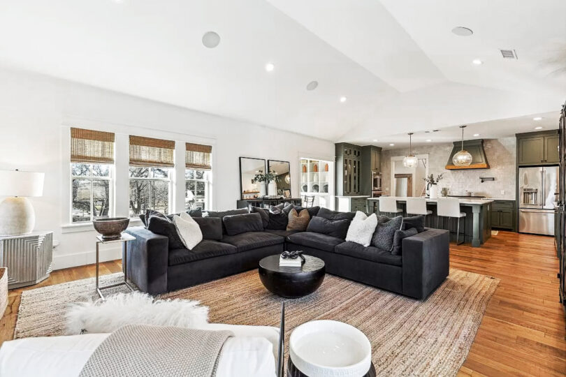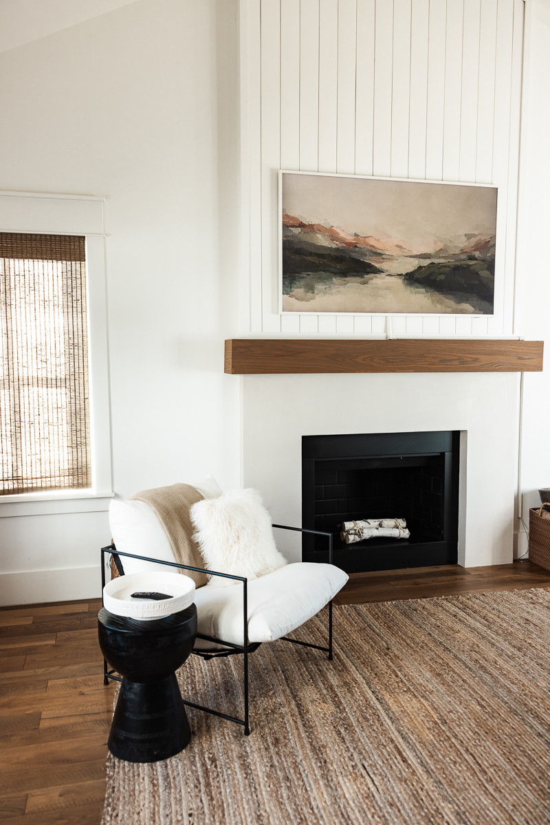 Sectional: West Elm Harmony Sectional | Chair: Kathy Kuo Home | Coffee Table + Side Table: Kathy Kuo Home | Rug: Amazon — HIGHLY DO NOT RECOMMEND | Tall Metal Cabinet: Dovetail | Metal Sidebar Console: Dovetail | 65″ Frame TV (artwork over the Fireplace) | Black Frame Mirrors: Amazon