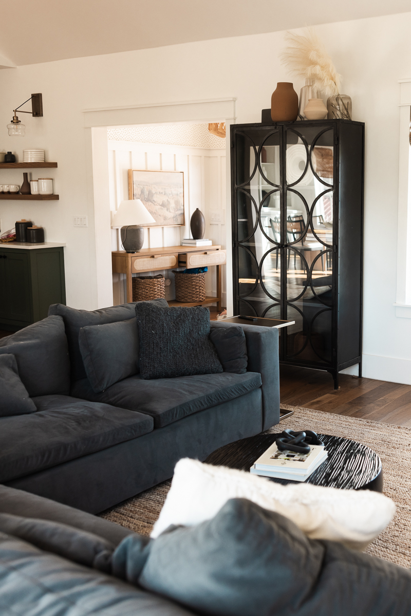 Since the house is so light and bright, I was able to bring in a lot of darker pieces from our traditional house and it felt like a perfect fit. The couch being a dark slate grey balanced out the light walls, too without feeling too heavy. (By the way, we have the sectional in ‘Slate Performance Velvet’ fabric. It’s very nice for kids and pets!)