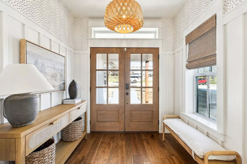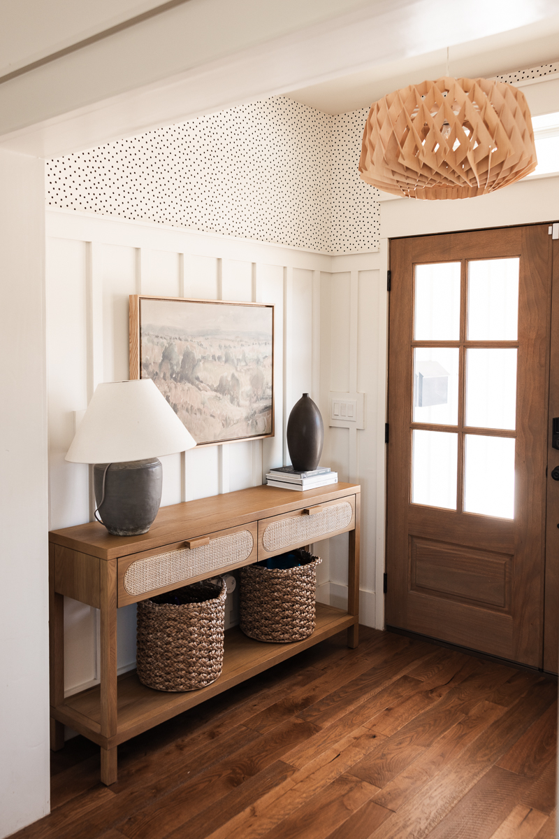 Console Table: Four Hands | Similar Console: Home Depot | Painting: My Texas Home via Walmart | Vase: West Elm (n/a) | Baskets: Target | Lamp: Target (n/a) | Wallpaper: unknown | Bench: Target (Similar)
