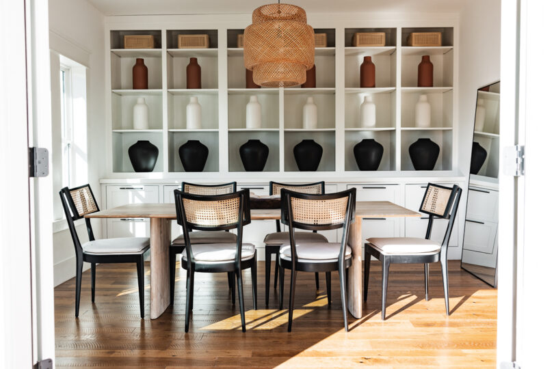 Cane Chairs: Kathy Kuo Home | Dining Room Table: West Elm | Vases: West Elm | Pendant Light: Ikea