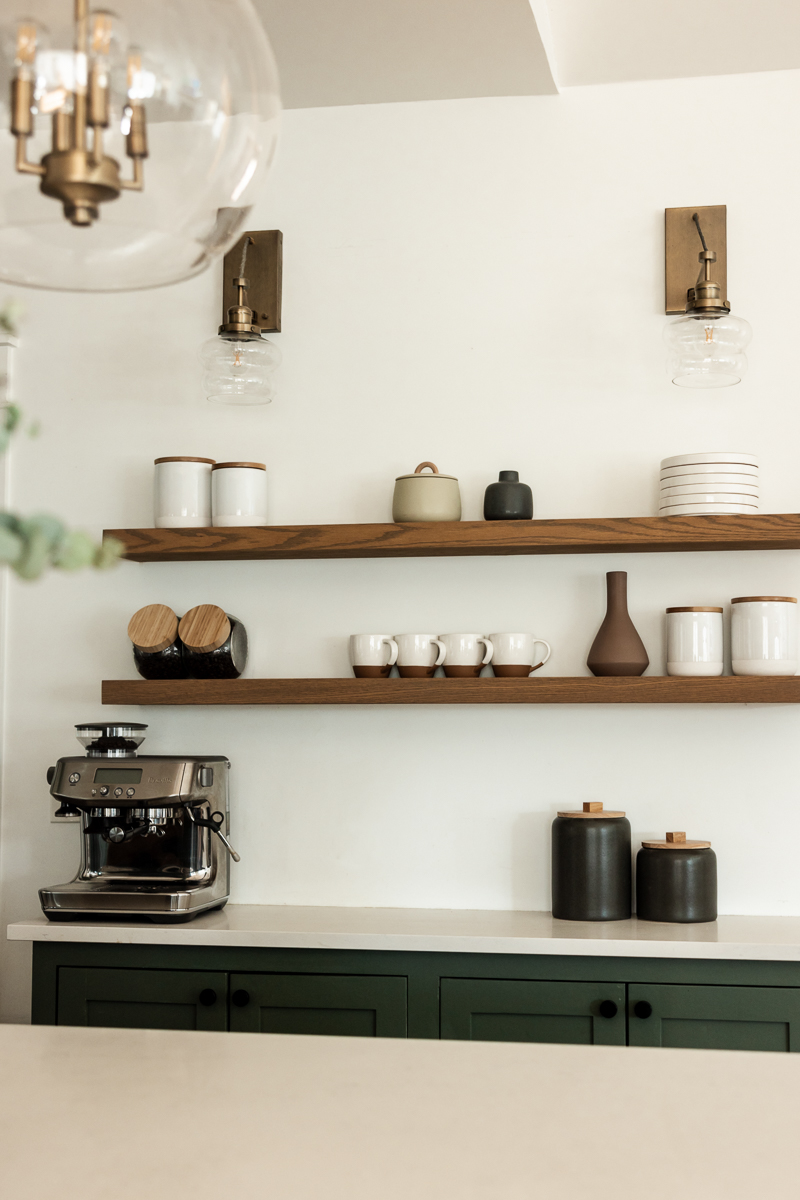 The only thing I would change about the kitchen if I absolutely had to would be the open shelving. Beautiful, but literally no function if you want to keep it pretty. I would’ve continued on that wall with the same tall cabinets, if it had been up to me. Storage is more important to me than the open shelving. She beautiful, but pointless. Of course, hindsight is 20/20 and the open shelving is what I loved about the kitchen so there you go.