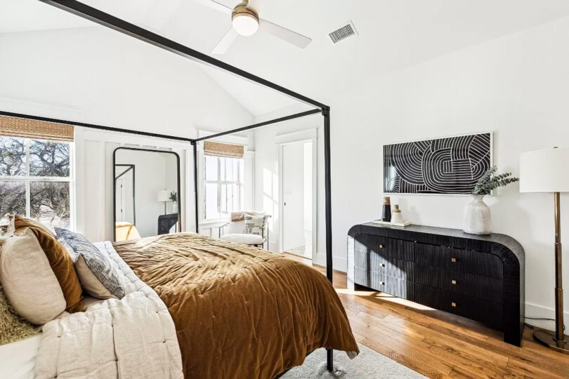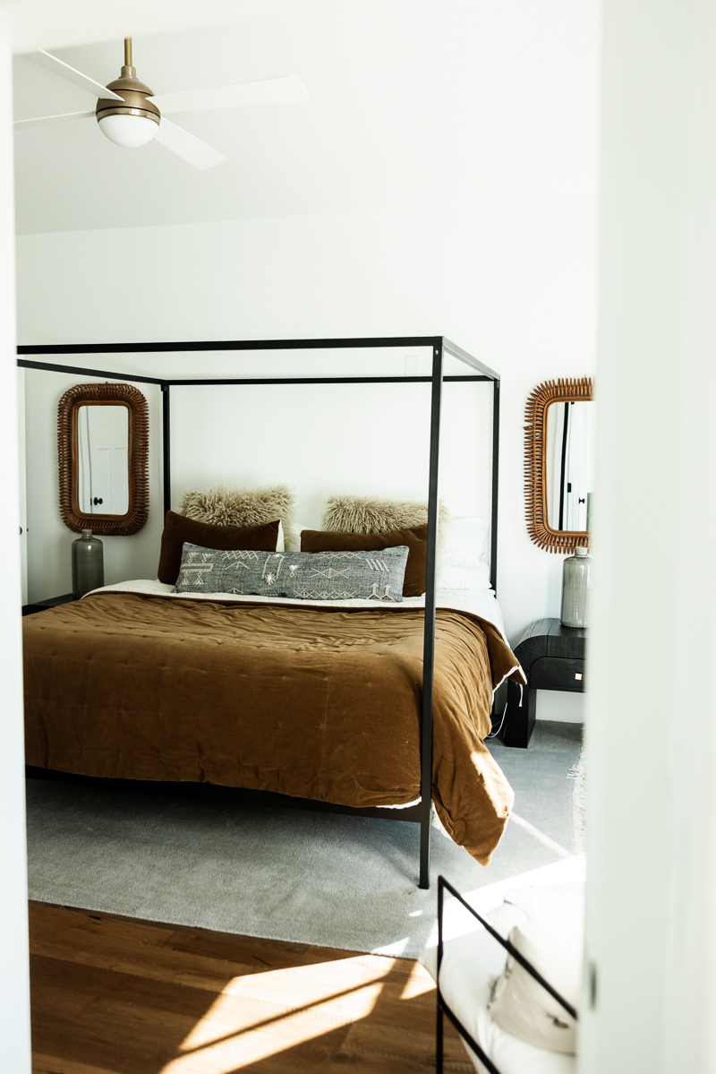 Metal Canopy Bed: Allmodern | Night stands: Allmodern | Dresser: Allmodern | Bedding: West Elm | Mirrors: Wayfair | Rug: West Elm | Chair: Kathy Kuo Home