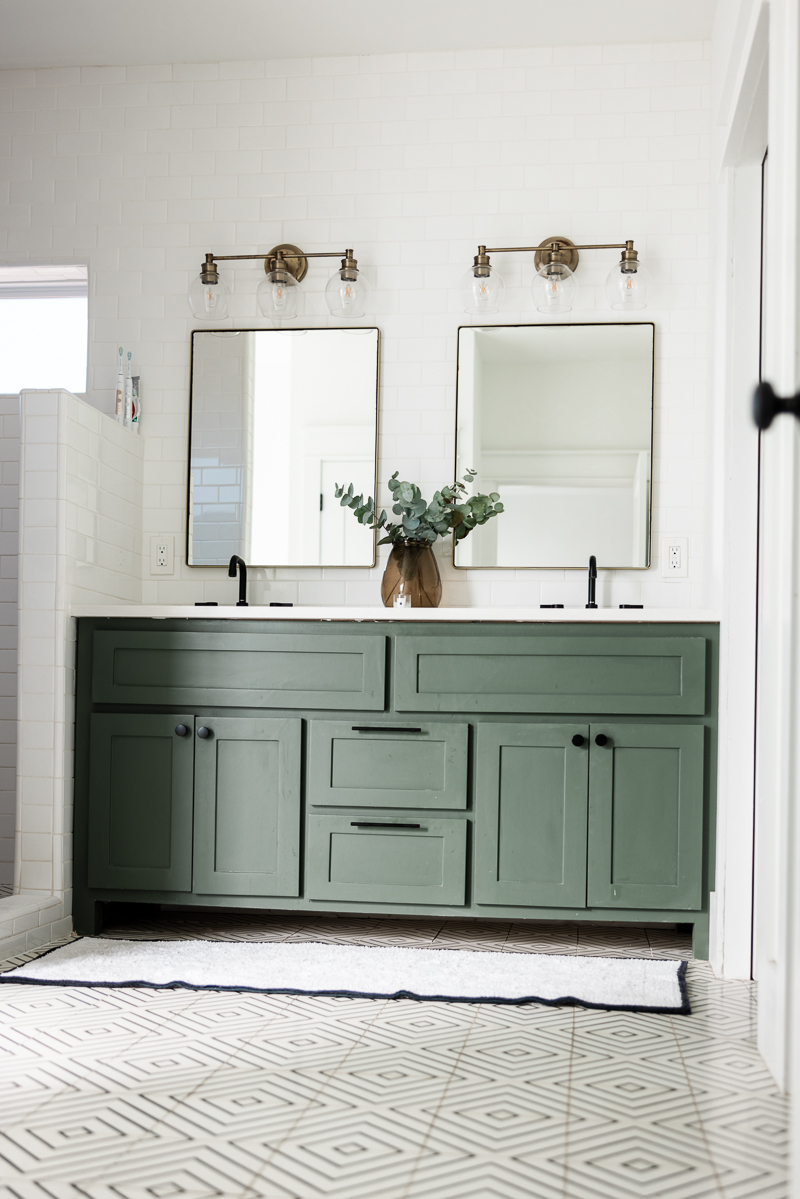 The green cabinetry is carried out through the house from the kitchen to the bathrooms to the laundry room. I found it to be a nice tie in throughout the house. Again, I like symmetry and I can be quite matchy-matchy with my colors in a home, so I liked the tie in to the kitchen. It’s just such a pretty and calming hue and the contrast with the white is just perfect.