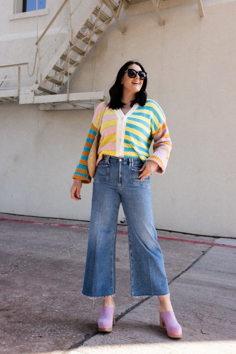 Is this cardigan a lot? She is. She’s all the colors and more. And I have to be honest, after wearing mainly neutrals for the last few years I’m feeling quite out of the box. I’m feeling a bit sheepish wearing so much color. So of course I went ahead and added the most colorful clogs I could find, too. Apparently “feeling sheepish” to me means going in even harder.