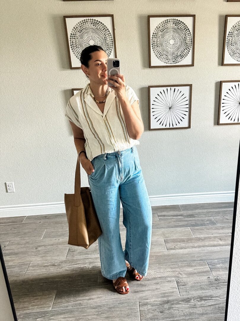 Madewell Linen Short Sleeve Top | Madewell Harlow Airy Denim Jeans | Zara Sandals | Madewell Bucket Tote (amber brown)