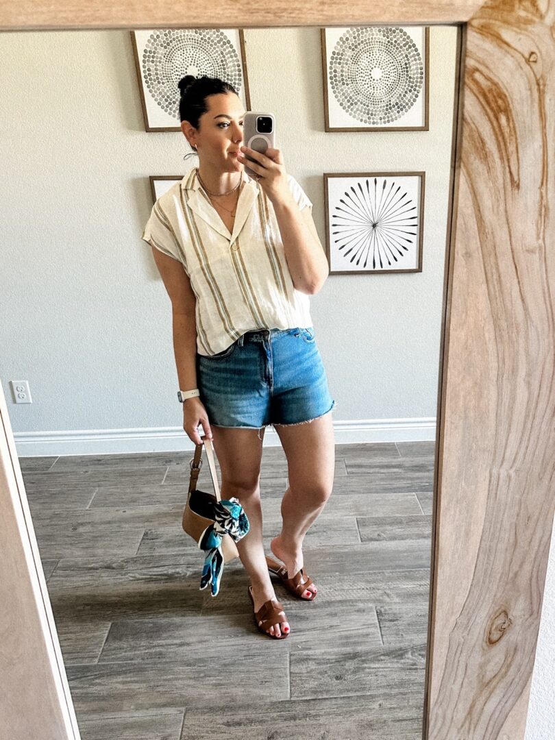 This is my go-to Kendi outfit this summer. A button down + denim shorts + those damn Zara sandals that have me in a committed relationship. I kinda wished I would have added a belt to this look — even chicer! Also, this is one of the best linen tops I’ve found — it’s from Zara. It’s oversized and a really nice wear. After the first wash and air dry, it was crunchy but I steamed it out nicely. Tiny bit of shrinkage but not bad for linen. I’m in the large! The shorts run — I find a bit small — so I am in the 31!