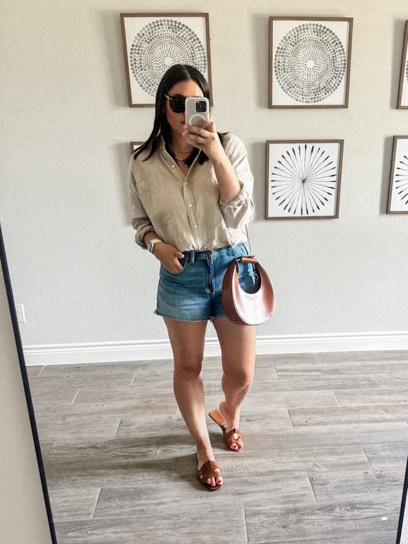 Madewell Linen Top | Madewell Relaxed Denim Shorts | Zara Leather Sandals | Madewell Purse