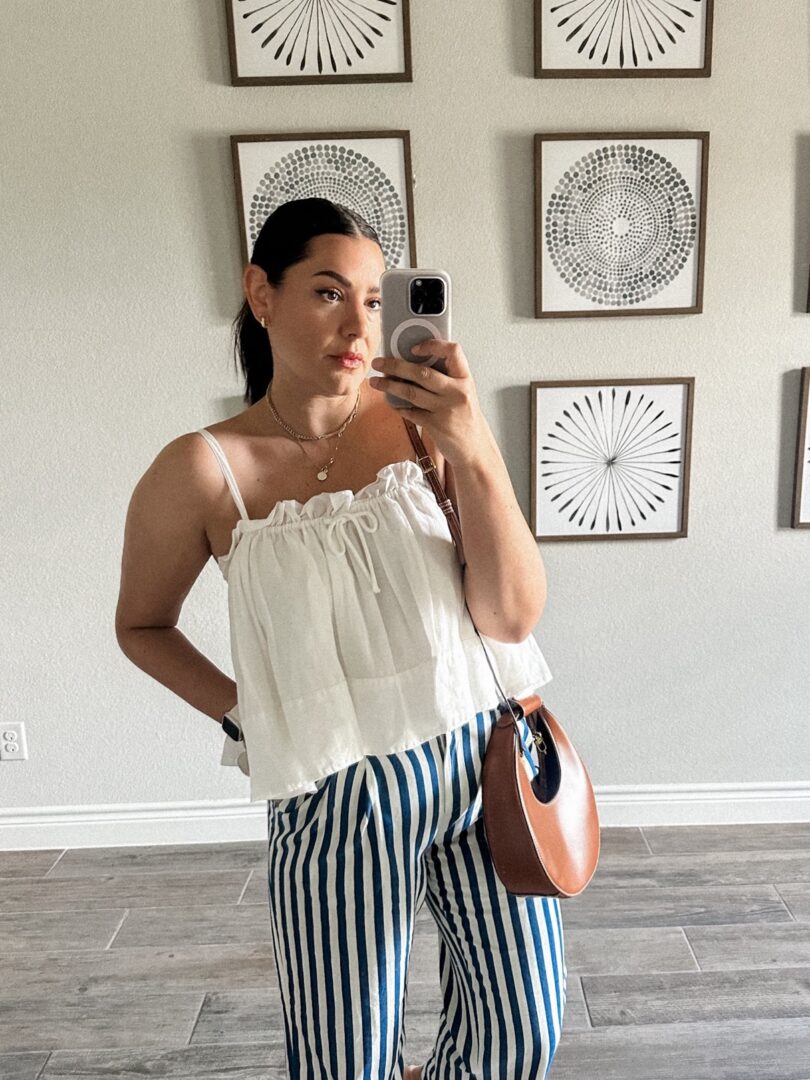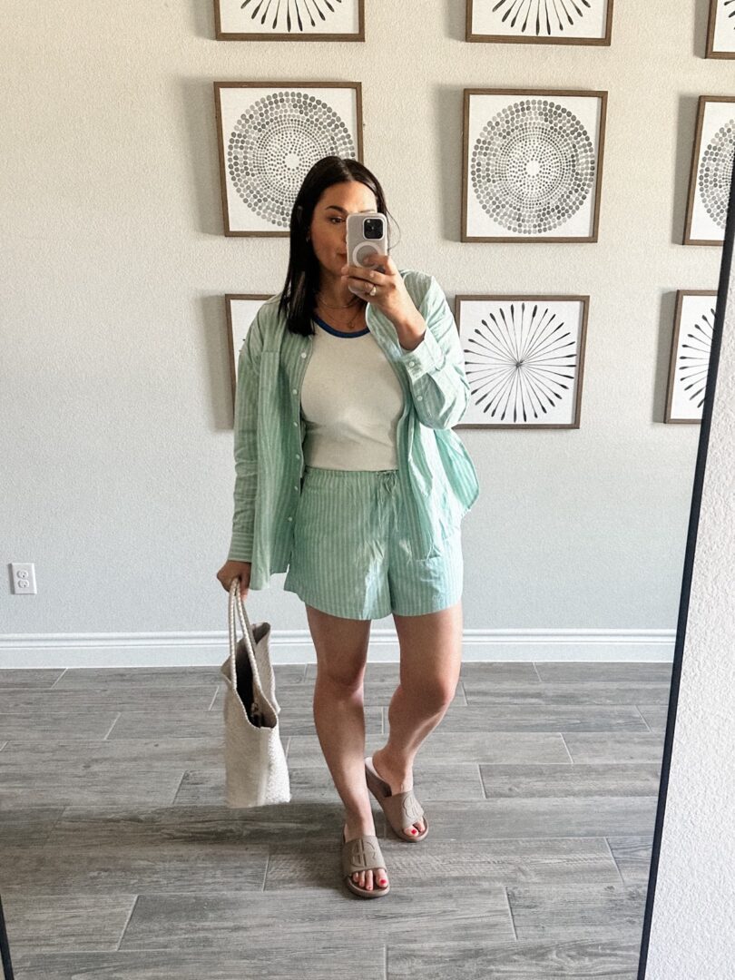 This one was my most loved on LTK last week! And I know why — it’s just so cute! This set is from Madewell but the pieces are sold separately. I am in the medium of the top, as it’s very oversized and I am in the large of the bottoms, as they run TTS. The tank is Free People and I wear the large!