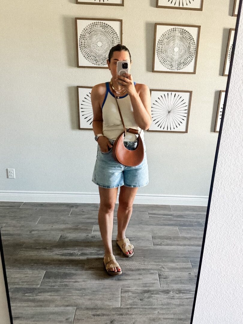 Here is that Free People tank again! A nice, light cotton tank but with coverage. It has a fun retro vibe too, which pairs nicely with my 90s mom shorts from Zara (I wear the 10!) I am in the large of the tank and I am wearing a strapless bra with this tank. The one I’ve sworn by for a decade is found here.Â