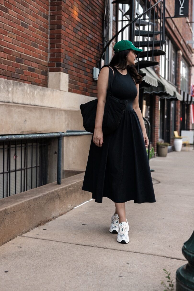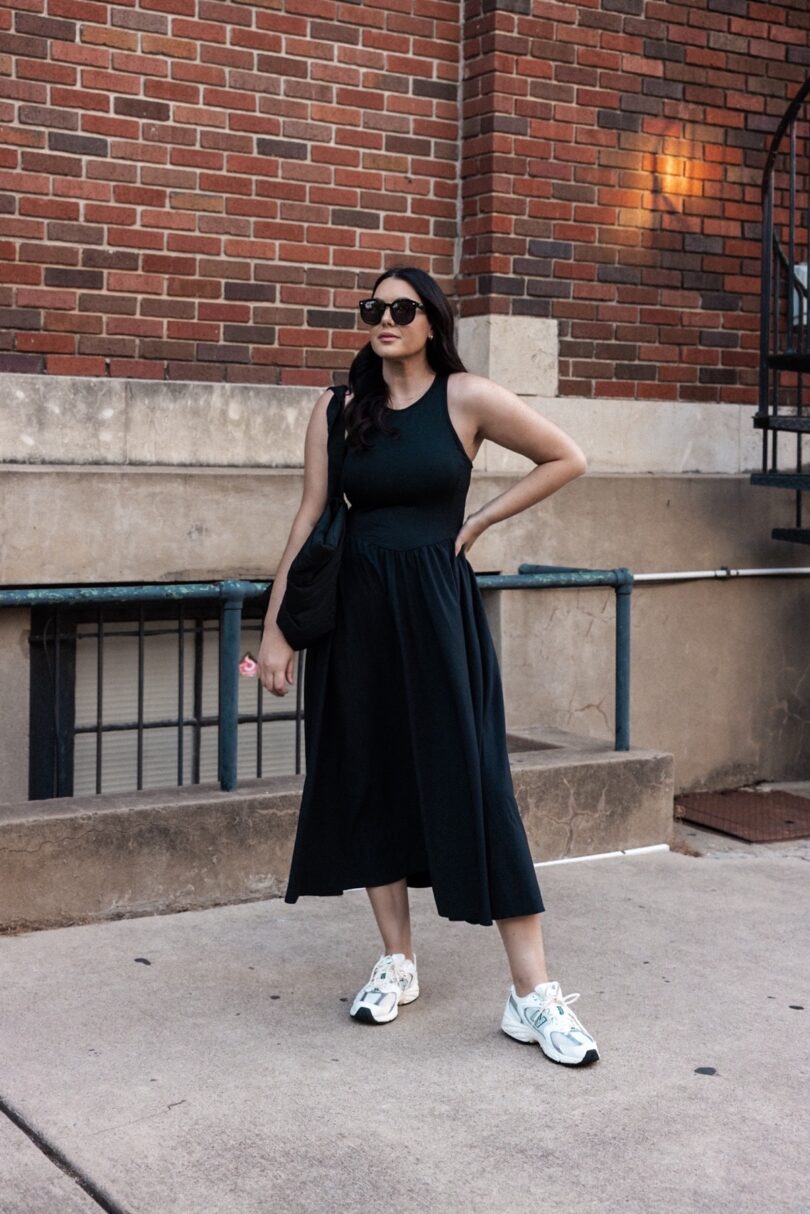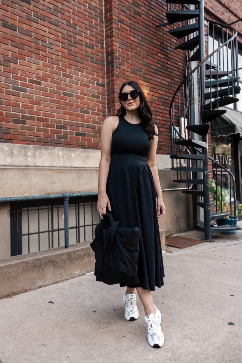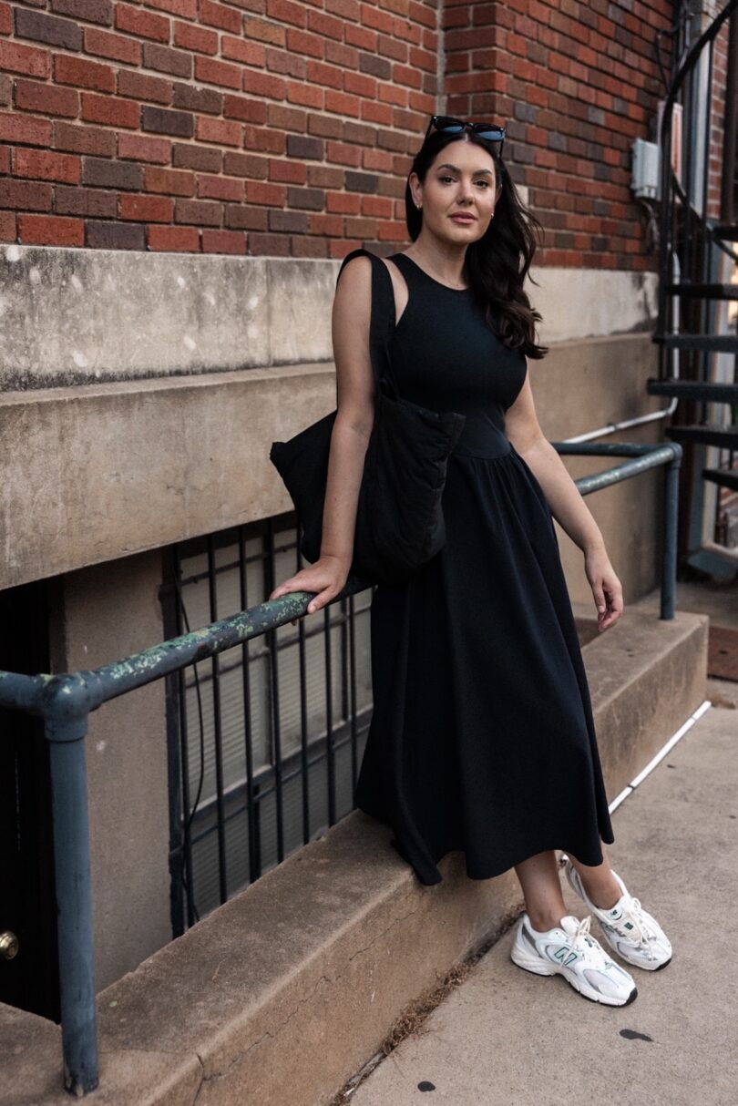I was afraid that this outfit would go wrong with the shoes but I actually love the dad sneaker trend juxtaposed with this dress. The dress is activewear fabric, so while it looks like a nice fancy dress, it’s actually a sports dress. There is a built in sports bra as well, which I can attest to the function of this bra as well. I wore this complete outfit to our daughter’s birthday part on Saturday and it was perfect. The dress is so comfortable; I was able to run around but still be comfortable (and sweaty! lol)