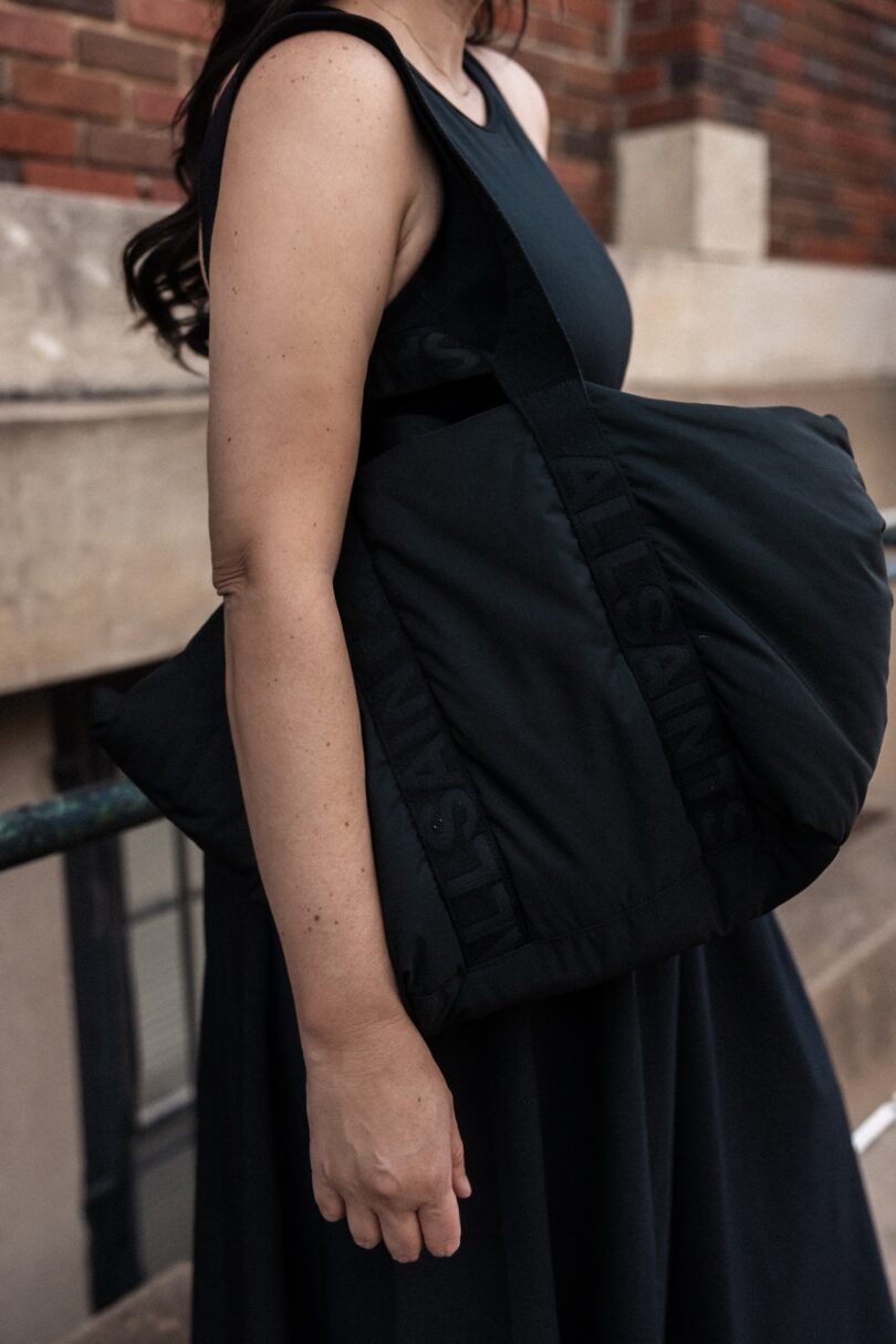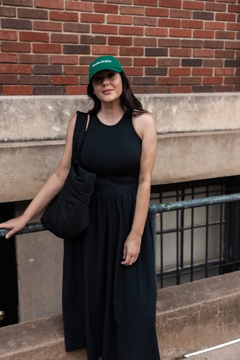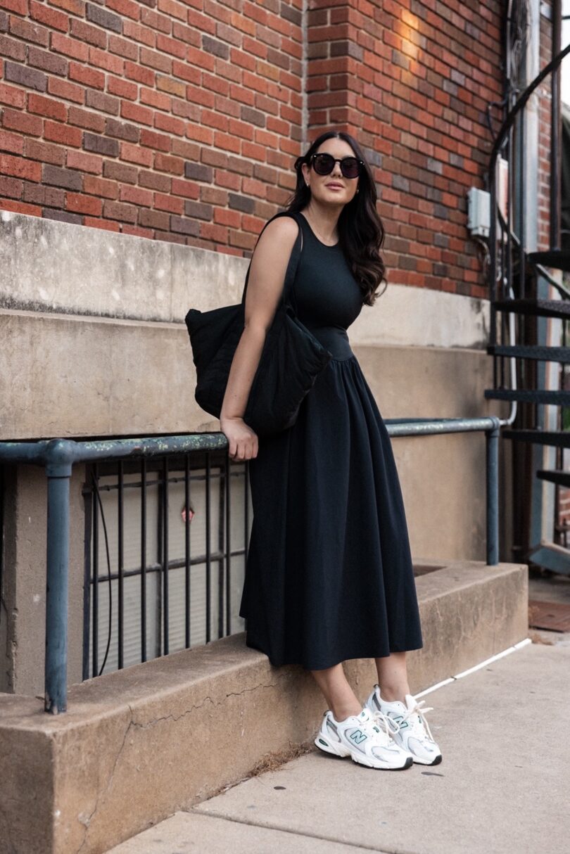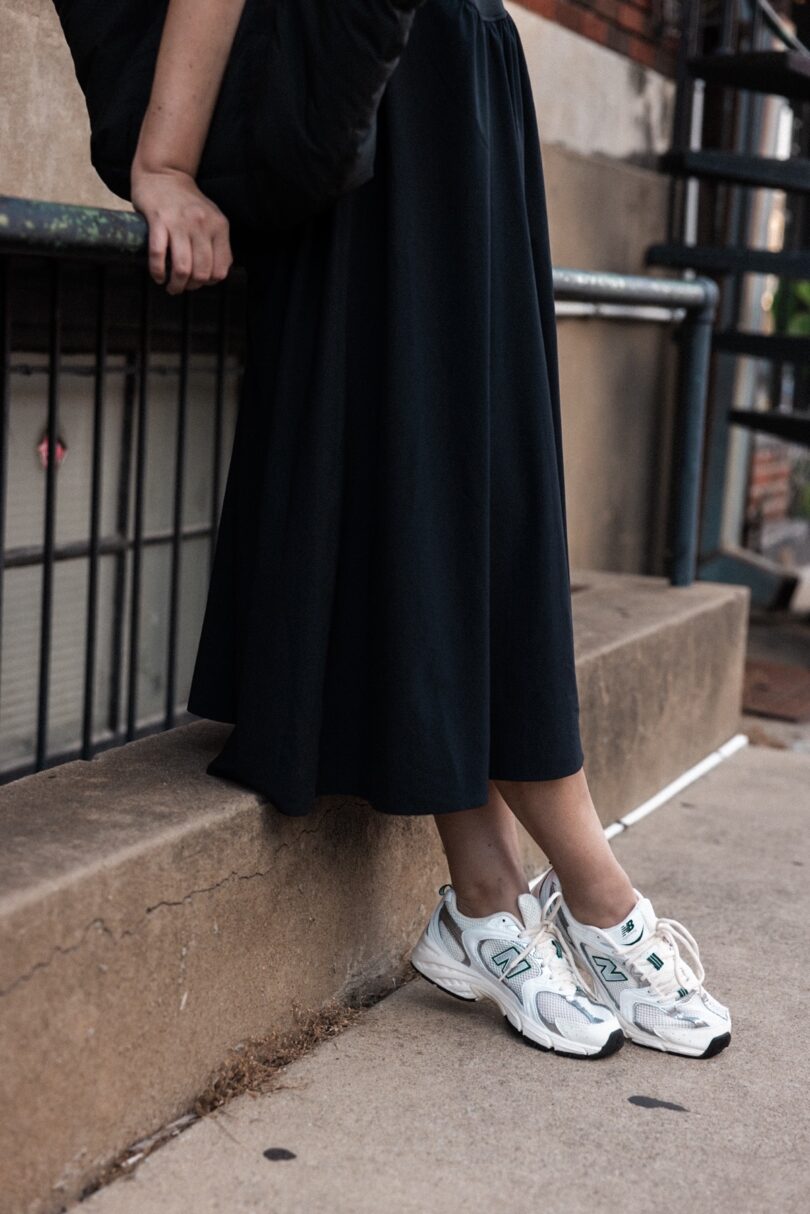 I was afraid that this outfit would go wrong with the shoes but I actually love the dad sneaker trend juxtaposed with this dress. The dress is activewear fabric, so while it looks like a nice fancy dress, it’s actually a sports dress. There is a built in sports bra as well, which I can attest to the function of this bra as well. I wore this complete outfit to our daughter’s birthday part on Saturday and it was perfect. The dress is so comfortable; I was able to run around but still be comfortable (and sweaty! lol)