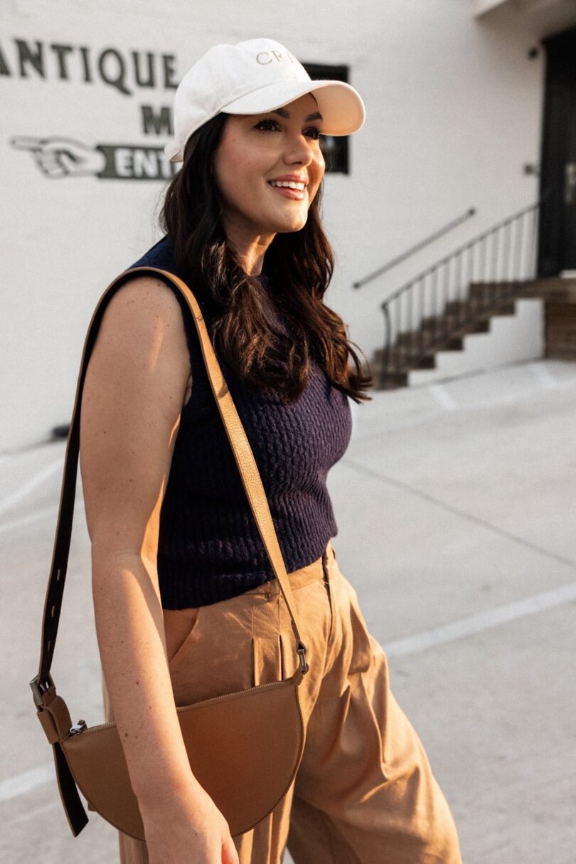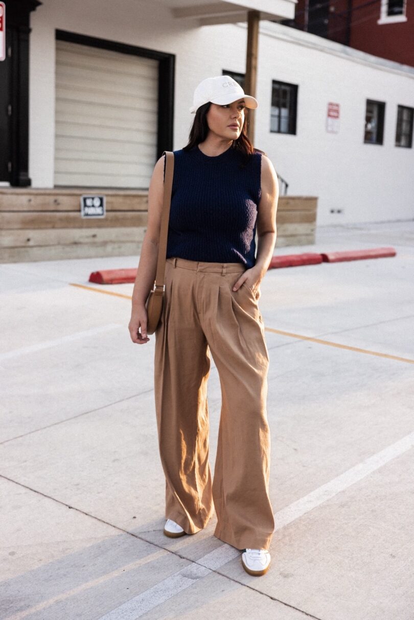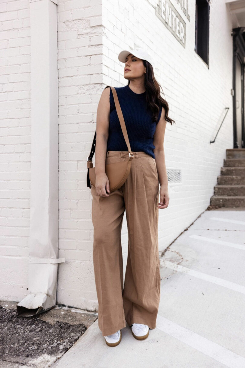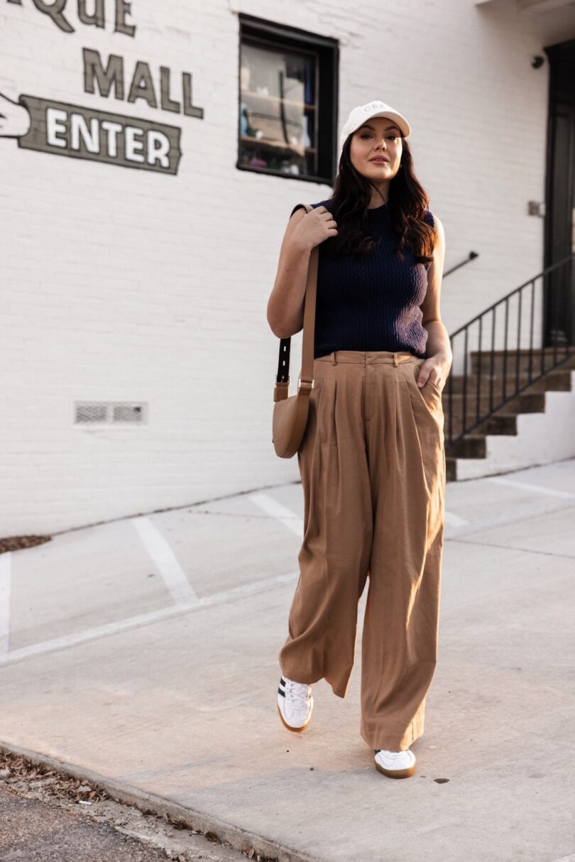 There is something about these trousers that just whispers ‘wear me with sneakers’ and so I listen. If your pants whisper to you, you listen. (As you can see it’s the only way I’ve styled them.) All that to say I will be ignoring the whispers next time and go for a heel or a different flat, but for now I gotta say – I love the sneakers and trouser mix. These trousers are so damn flattering and comfortable. Now I will say — they wrinkle. If you sit, they’ll wrinkle in the sit crease. If you don’t know what the sit crease is, buy these pants, steam them out, sit down for an hour, get up, go to a mirror and look at the front of the pants. That’s the sit crease.