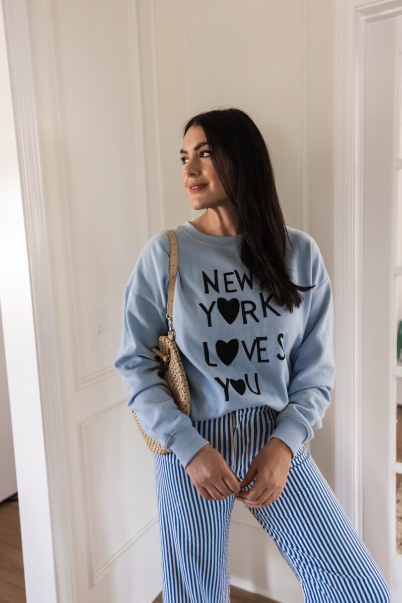 In the past few years I’ve been highly aware that yes I am a millennial. I think it started with the whole gen Z hates skinny jeans thing and then from there it just felt like everywhere I turned I was reminded that being a millennial was cringe. That getting older was something to pity and that the front tuck is just so embarrassing. I saw a reels the other day that said matching your outfit was cringe. Matching! I think that was the end of my very frayed rope because you know what? I’ve reached a point where I simply don’t care. I like being a millennial, I like being 40, I like wearing what I want to wear whether it’s deemed ‘cringe’ or not. And this outfit has all of those possibly ‘cringe’ things — a front tucked graphic sweatshirt, wide leg cropped pants and a low cut sock complete with a trendy sneaker with a crossbody bag. Oh AND it completely matches, head to toe. I am full millennial mom and I love it.