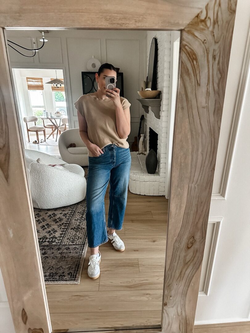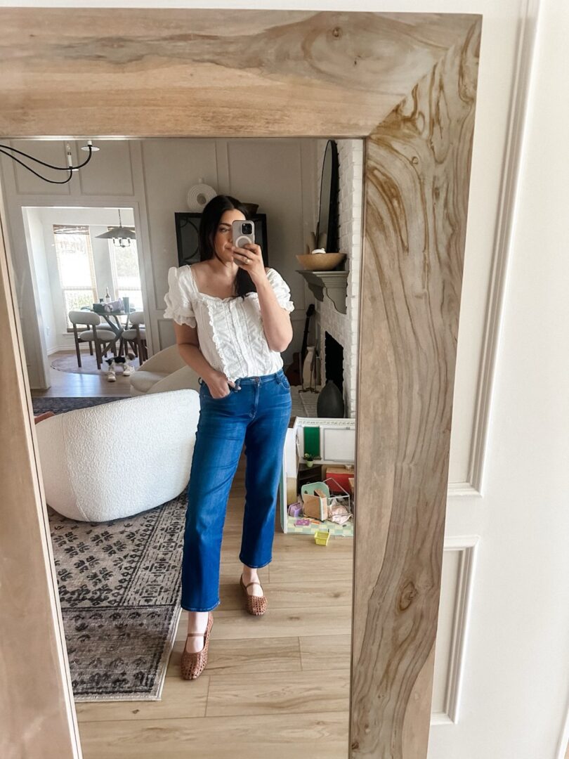 This is one of those outfits I wish I would have done different shoes with but too late now! I think a cute little ballet flat would have been the way to go. I love this top — it’s from Anthro and it just reminds me of the 90s. I’m in the medium — it runs big. The jeans are TTS! Some of my favorites from Quince.