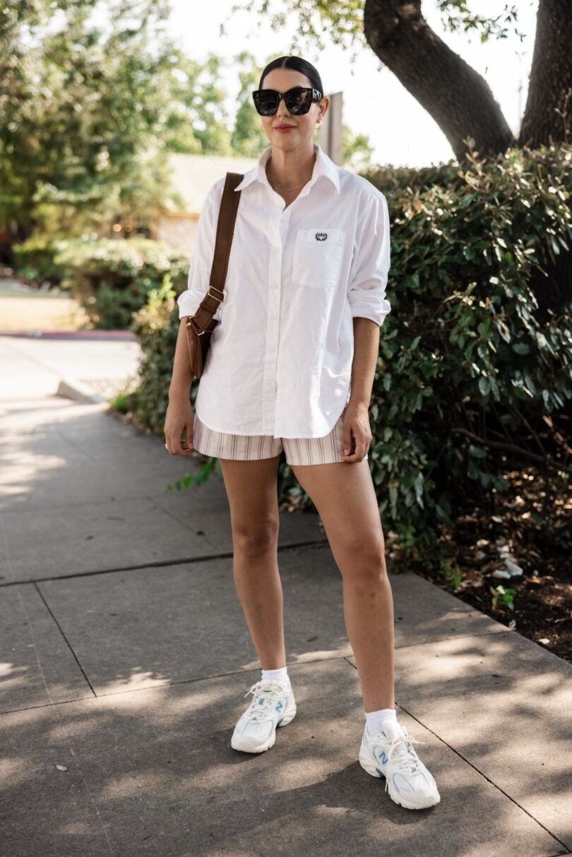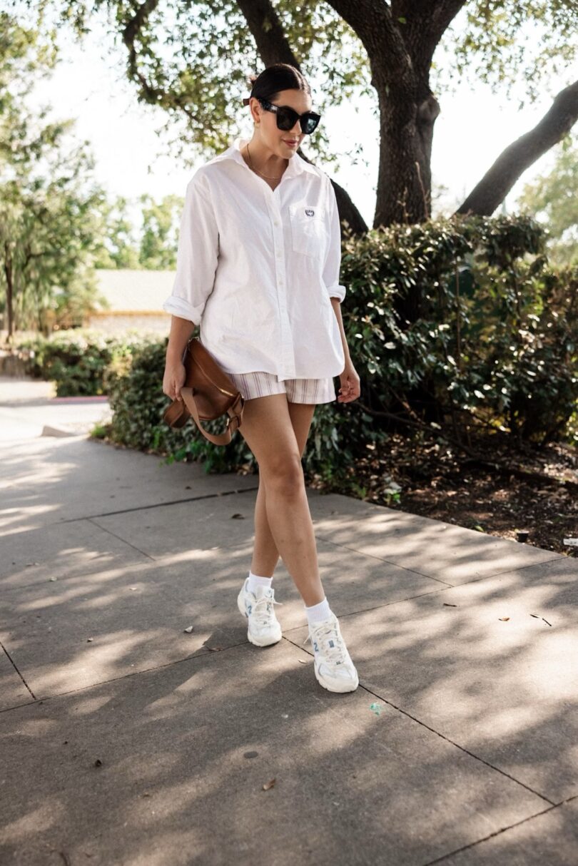 I paired my very favorite oversized poplin from Gap (the one I linked here doesn’t have the emblem but it is the same top!) with this pair of boxer shorts from Amazon. They are not the same as men’s boxers, as these are a thicker fabric that hold the shape, not loose cotton or in any way like pajamas. They have way more shape than regular underwear boxers, just in case you were wondering. I am in the medium of the poplin as it runs very oversized and I’m in the large of the boxer shorts. PS my top is on sale right now, too!