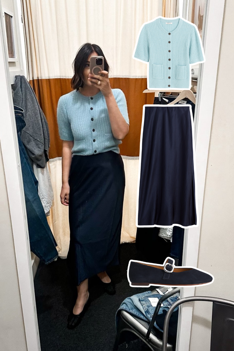 satin maxi slip skirt | patch pocket puff sleeve cardigan | remy mary jane
