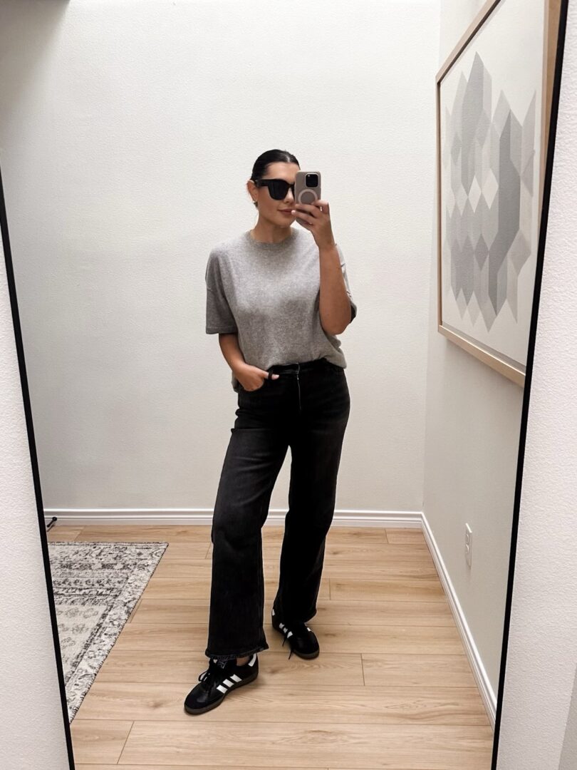 Madewell Cashmere Tee | Quince Jeans | Adidas Sambas | Aire Sunglasses