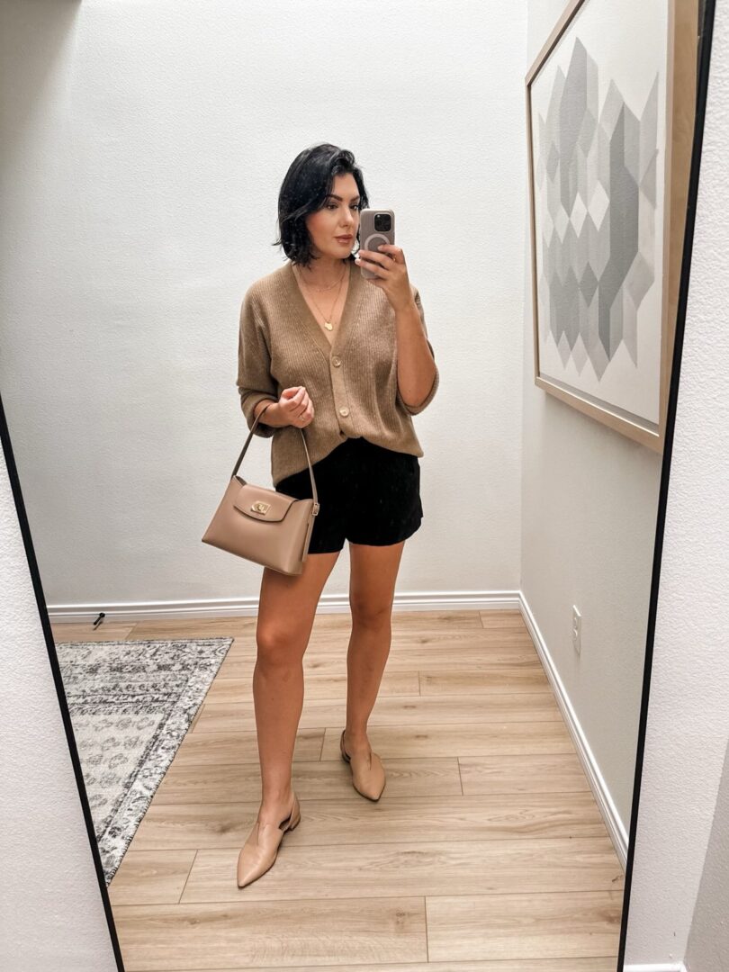 Quince Cashmere Cardigan | Quince Crepe Shorts | old Vince Flats (similar here) | J.Crew Handbag