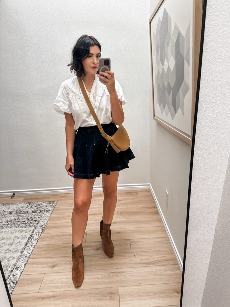Zara Eyelet Top | J.Crew Denim Skirt | J.Crew Booties | Allsaints Half Moon Crossbody