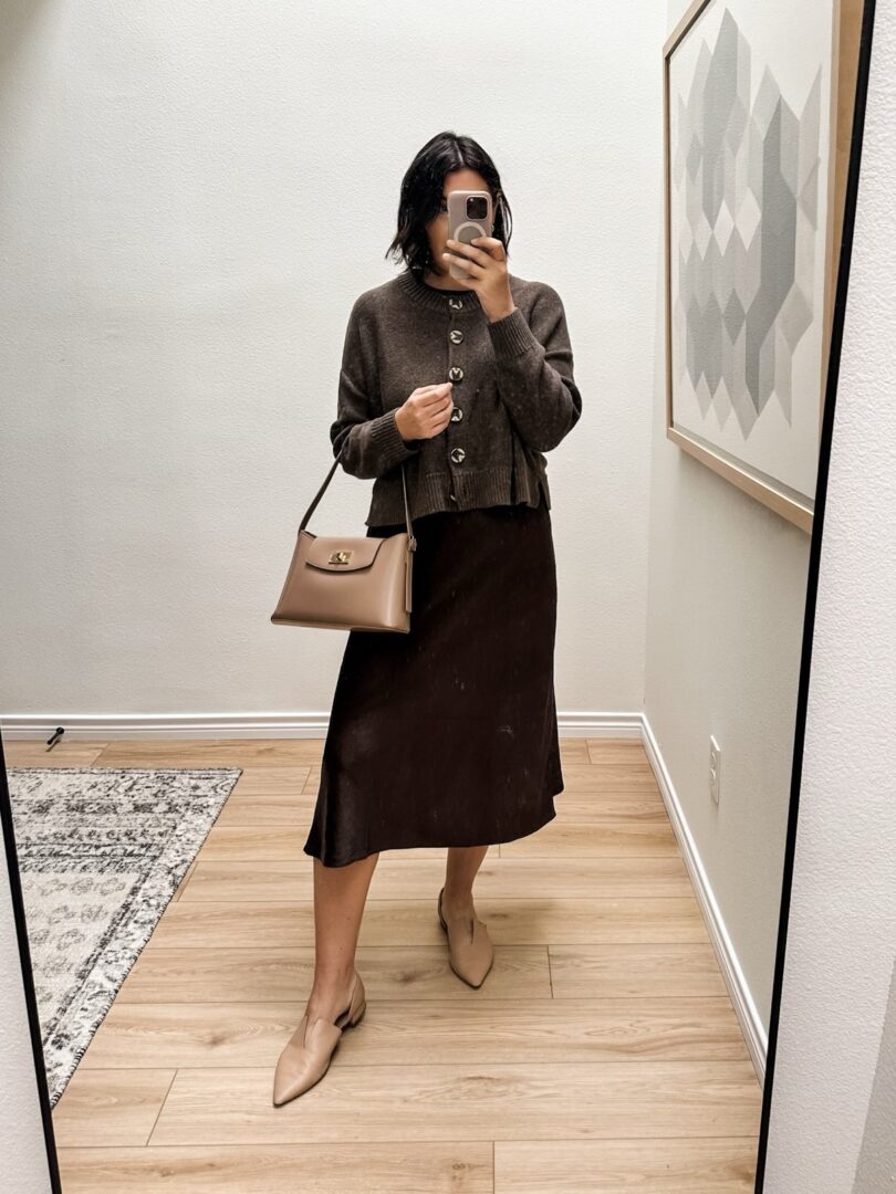 Lunch + coffee date | This was one of those grey days I was telling you about so it felt right to dress very fall. I like this outfit in theory but wish the cardigan was just a bit more cropped. I am in the large of the cardigan so it fits more relaxed than expected. Also this dress from Madewell is a 10/10! I’m in the 10…so I guess that makes it a 10/10/10? Size up for hips / waist looseness only.