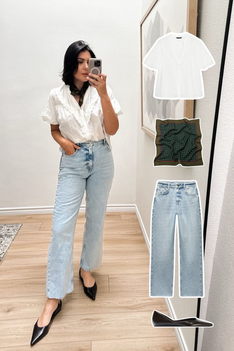 This eyelet top you’ve seen before and it’s a favorite. I’m thinking about pairing it with this scarf and a trench later this week. Sounds cute right? Always versatile and works well for going into fall, especially with all of this fun denim I’ve been sharing lately. It’s a nice Sezane vibe without Sezane prices.