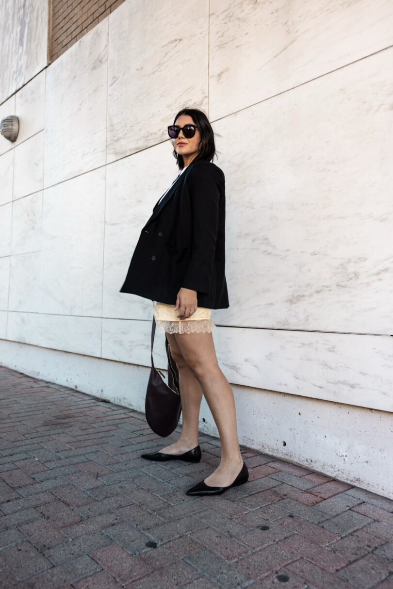 Look, I basically bought this skirt because of the outfit J.Crew styled online. Yep — they did it. The styling and marketing department got me. I’m a sucker for J.Crew styling and I knew I could recreate this whole look with what I had in my closet. I was a bit apprehensive about the light yellow color but it’s absolutely beautiful. So with my trusty white tee and this oversized blazer, I styled this outfit just like on the model. I was hoping it would work in real life and I’m thinking that it does. The black and the yellow work so well balancing each other and I added in my dark chocolate flats and purse, just to break up the darker hues.