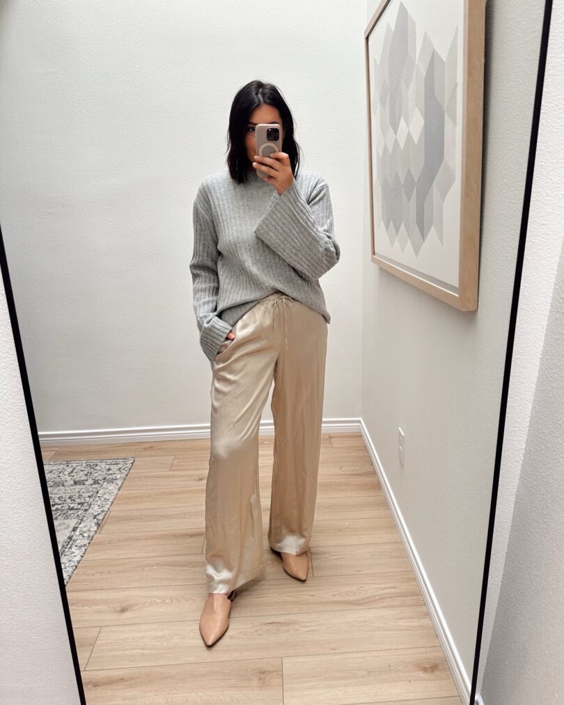 I am in the large of the silk pants, I sized up for a looser / longer fit. Love how they fit on me. The waist is a drawstring and it is adjustable. These are going to be nice to have going into the holidays; they’re an easy ‘festive’ pant without being festive you know? Like pair a red sweater with these and boom — festive.