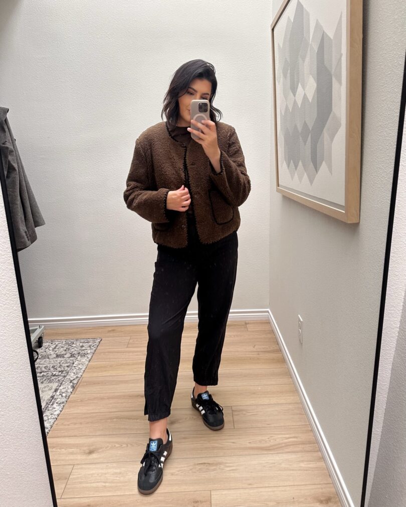 I’m in the 30 of the Quince jeans. I find they run a bit snug in the waist but overall true to size! I am in the medium of the zip up — it’s plenty relaxed. Super soft, too!