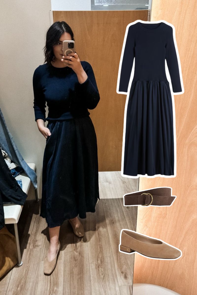 This is a great dress for Thanksgiving or family photos. It is a stretchy sweater top and a layered cotton skirt that are sewn together. Now it is shown as a drop waist and maybe on someone else it is, but I really liked it when I pulled the waist up and made the sweater look like the skirt is kind of ‘tucked’ under it. It’s so comfortable and if you wear it this way, it’s quite flattering / easy to wear. Just my two styling cents!