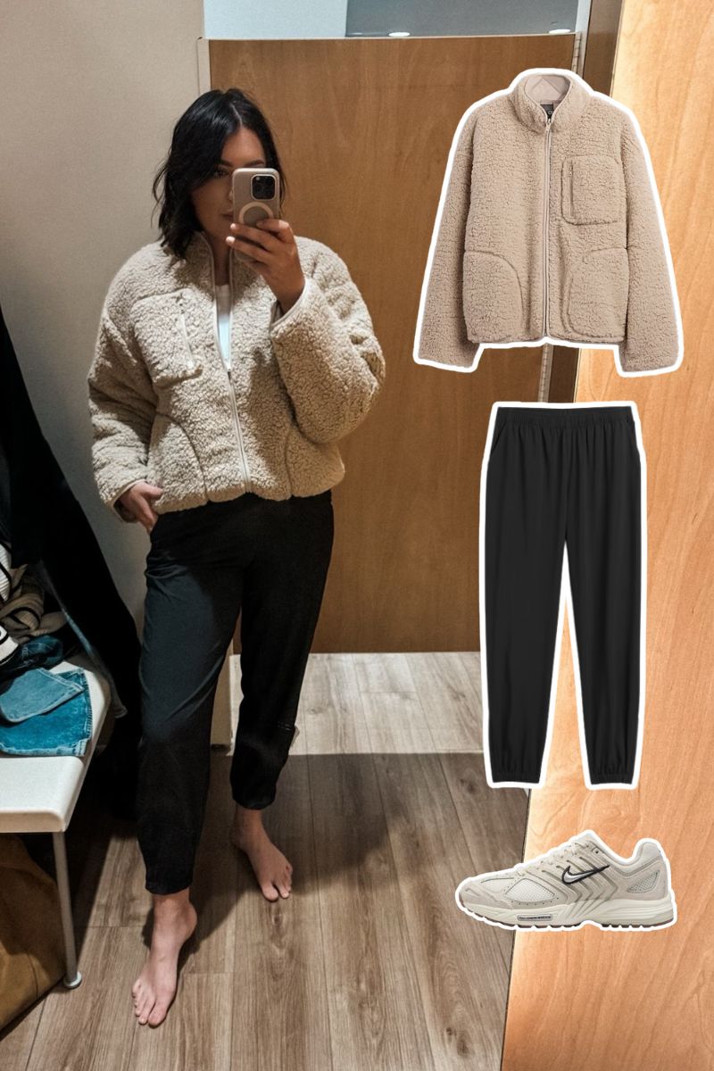 - There are just a few of this reversible sherpa jacket left but I highly recommend it! I’m in the medium, it fits true to size. I also LOVE these joggers but they aren’t for warmth, more of a workout / gym weight than winter weight.
