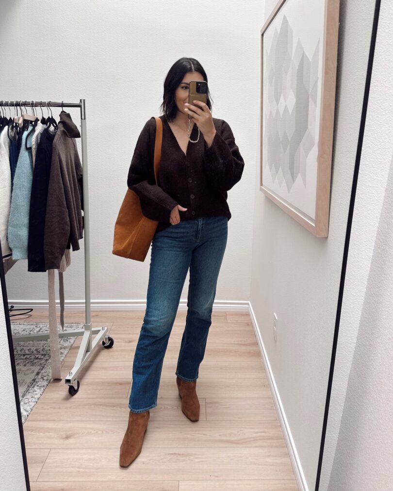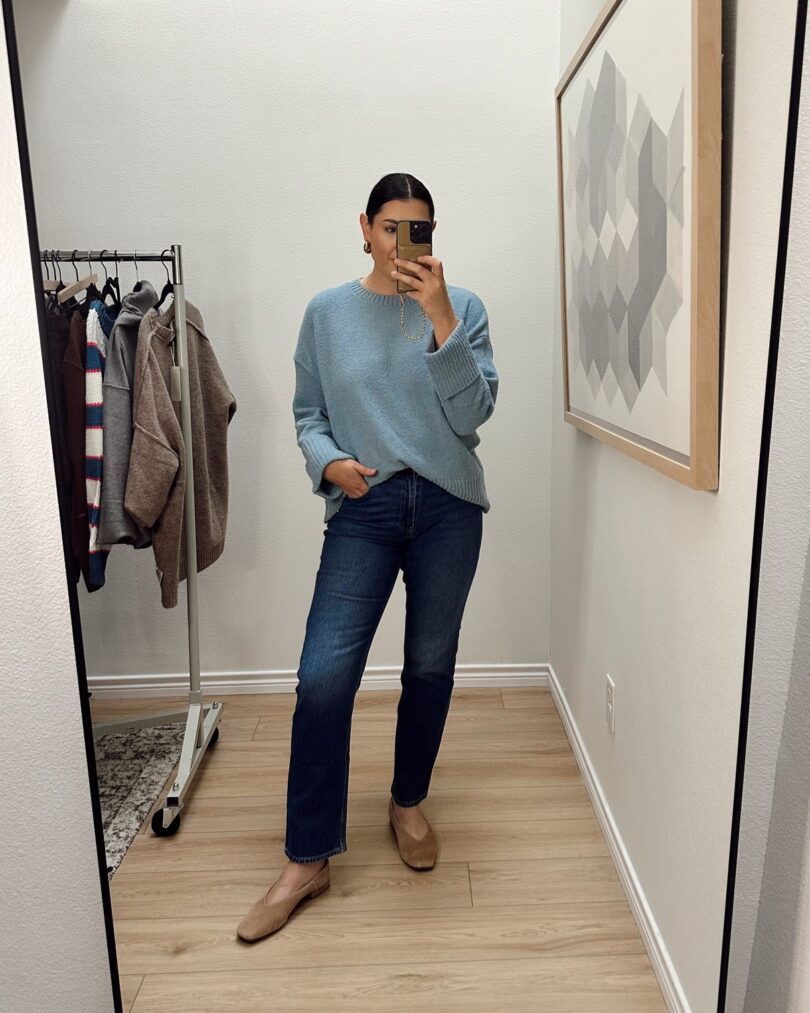 Hello my friends! Wow has it has been a week! December is flying by, as it does and the weather here has not been cooperating with my shooting schedule. (We usually shoot a few outfits on the weekends!) So thank you for being patient with the selfie content lately. I will say, as an update to last week’s post, I have finished my Christmas shopping and this might be a new record. Okay except for a few things I have to get in store, but that doesn’t count. 80% done is finished in my book. This week I launched the last upload of the year in my pre-loved shop and I’m wrapping up some partnerships for the year. I’ll be honest, my brain is tired and so are my outfits. A lot of sweaters + pants, sweaters + jeans around here. So is this my most exciting WIWLW-ish? No, but I am now getting very close to the ‘at least I tried’ portion of December / January. So at least I had real shoes on this week? Next week it’s all clogs and slippers.