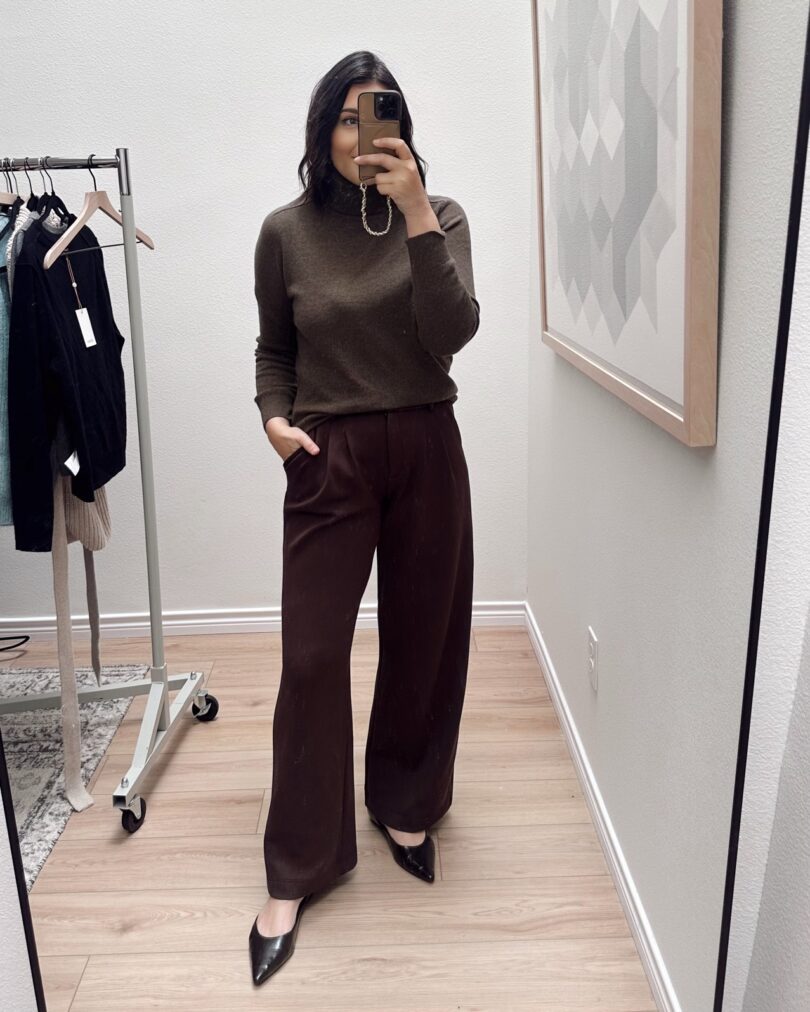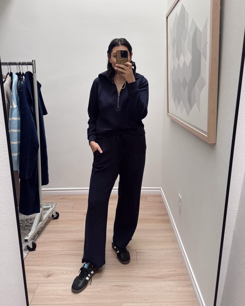 So these pants are actually sweatpants material! I didn’t realize this when I bought them but sure enough they feel like sweats but look like trousers. You will not hear me complaining…I will gladly wear sweatpants masquerading as trousers. I paired them with my Quince turtleneck I’ve been loving as well and while it wasn’t a perfect match, it’s close enough for me!