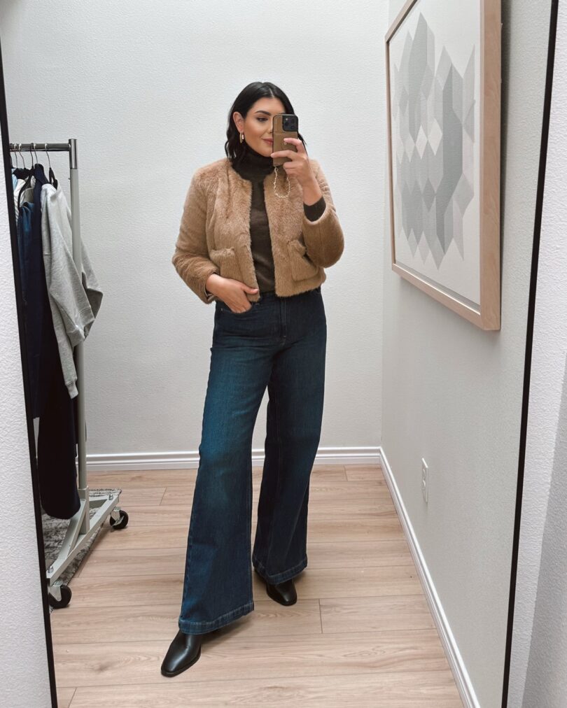 For our date night, I went pretty casual until I tossed this faux fur jacket on. It’s giving mob wife and I like it. Also this is the cashmere turtleneck from Quince, I go up a size for a looser fit (I’m in the large.) These jeans are gap as well! They’ve been on sale for $35 so hopefully that sale sticks around through this weekend. I’m in the 30, find them here.