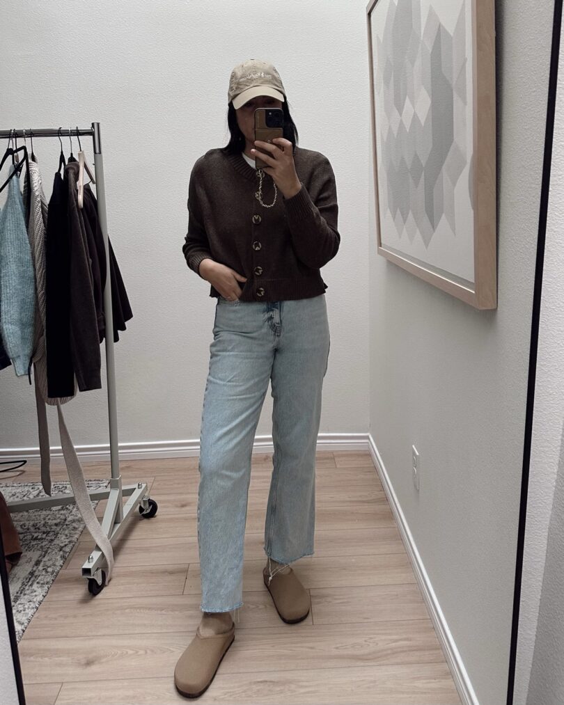I gotta be honest I hated this outfit. I didn’t feel cute wearing it and almost didn’t post it, but sometimes you just gotta content as a content creator. If you’re wondering, ‘um you have free will, why did you wear this?’ well we needed to run out the door ASAP and I just needed to toss something on. This is what got tossed on. It be like that sometimes, you know? It stated with my shoes — you see I wanted to wear my clogs, and I found these jeans on the floor so then I just tossed on the closest cardigan I could find. This is one of those times that the parts are greater than the sum. The hat was a Hail Mary. But the outfit got the job done, as we conquered our last minute shopping lists and played at the park. Oh and I’m just remembering how WARM it was this day! Absolutely none of this outfit made sense for the almost 80 degree day we had. (I mean Gemma was in a tank top!) But that’s on being rushed and not checking the weather app. Bloggers, they’re just like us.