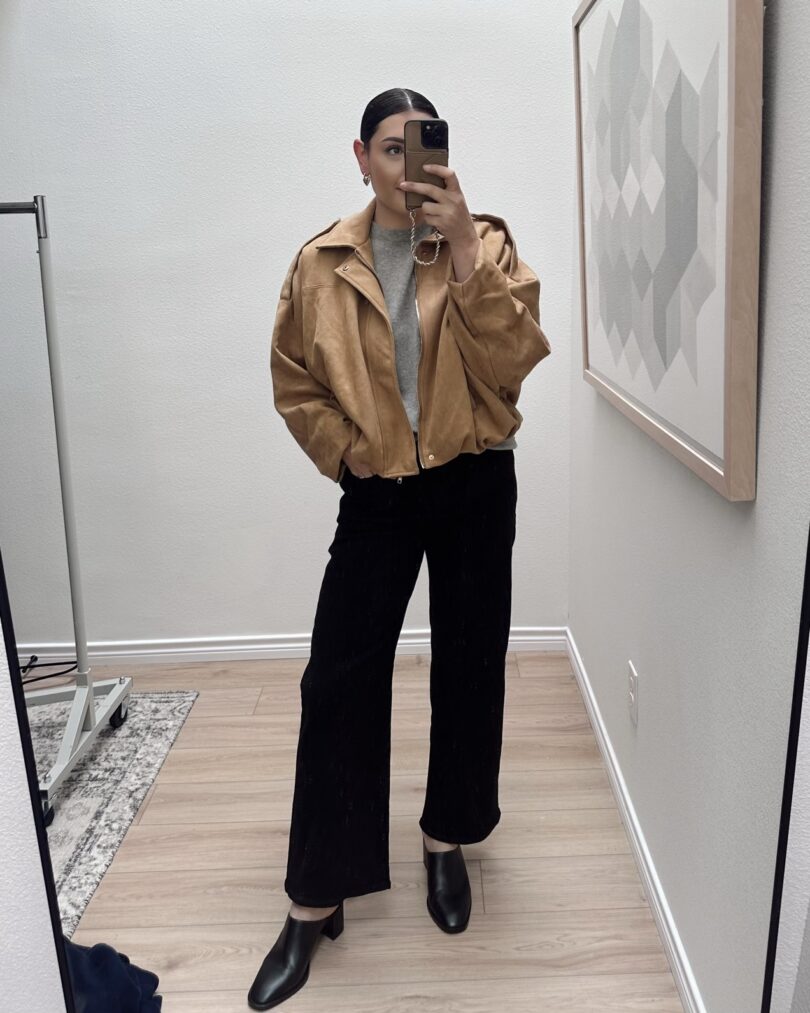 You’ll notice the only time I dressed up was for when we left the house. Otherwise, I can’t be certain I even wore pants. B and I took advantage of a kid-free afternoon and hit up a happy hour on a patio at a wine bar we just discovered! I wore this jacket because it was one of those kinda warm / kinda cool afternoons and this was the perfect weight. Highly recommend this jacket, it’s a really nice quality. Someone asked me if it was actual suede, too! (it’s not, but it’s super super soft faux suede.)
