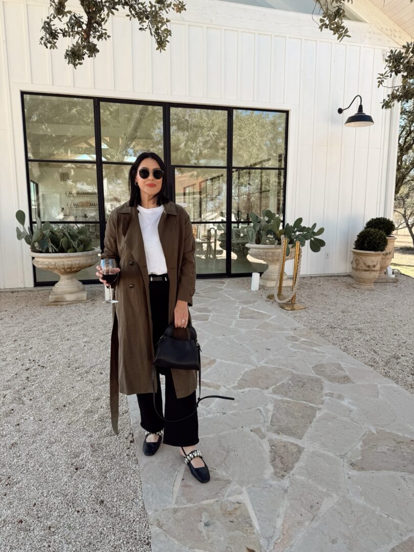 Similar Trench | Madewell Jeans | Jeffrey Campbell Flats | Quince Purse | Gap tee