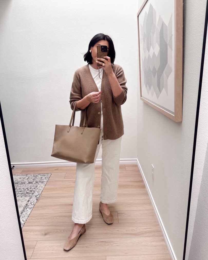 Quince Cashmere Boyfriend Cardigan | Madewell Tee | Madewell Jeans | Suede Flats | Similar Tote
