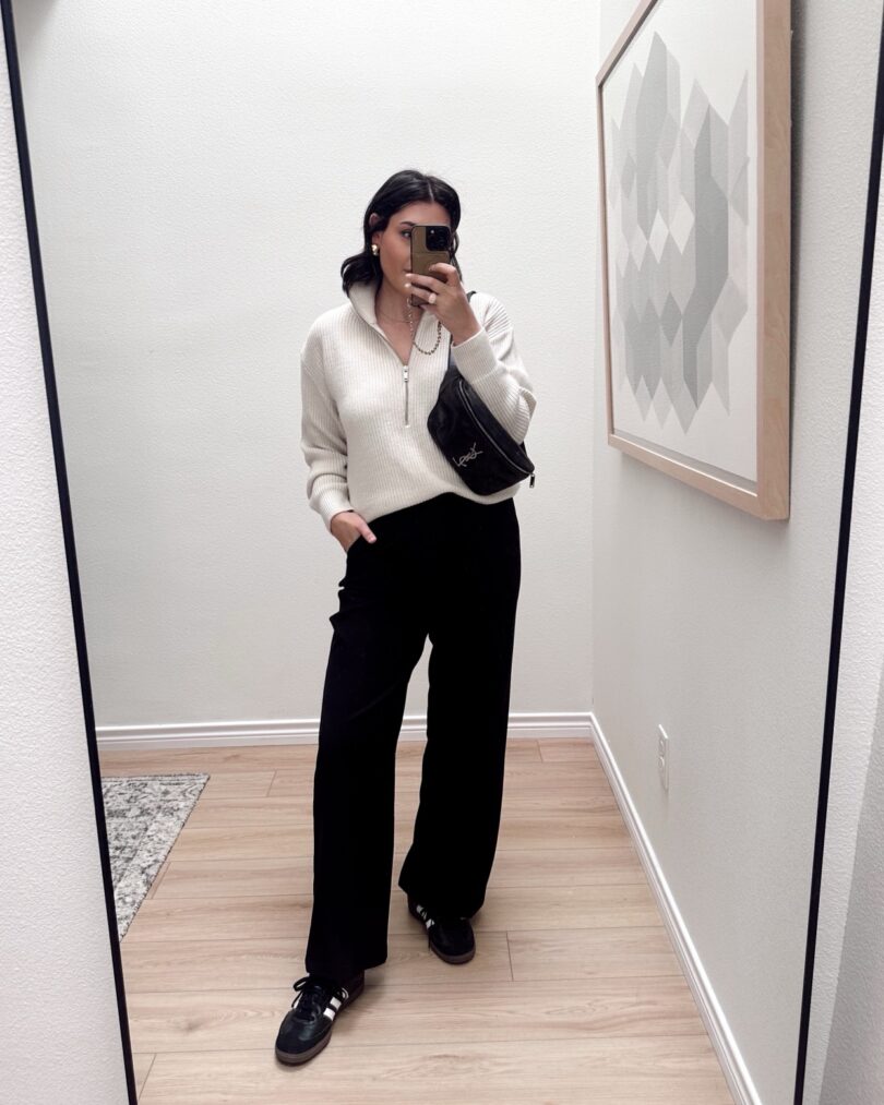 Quince Quarter Zip Pullover | Amazon Trousers | Adidas Sambas | Similar Crossbody YSL
