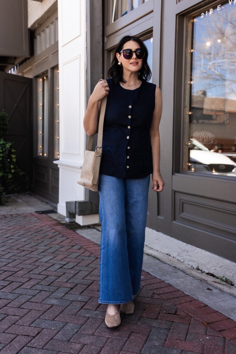 This is the Luna Wide Leg jean and I don’t know how I missed this pair. It’s the perfect wide leg jean, but not *too* wide leg. It’s a mid-rise fit and the leg fits a touch straighter through the hips than the Bella. I’ve been a long time believer of the Bella relaxed straight jean (it’s my favorite) but I’ve also loved the Bella Wide Leg and the Kick Flare and the Barrel. I’ve tried them all, my friends. But the Luna gives a more casual relaxed fit and VERY stretchy, which I love. I find all Quince denim to have very similar fabrics, so they feel similar but perhaps a touch stretchier than the Bella.