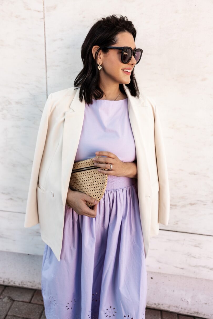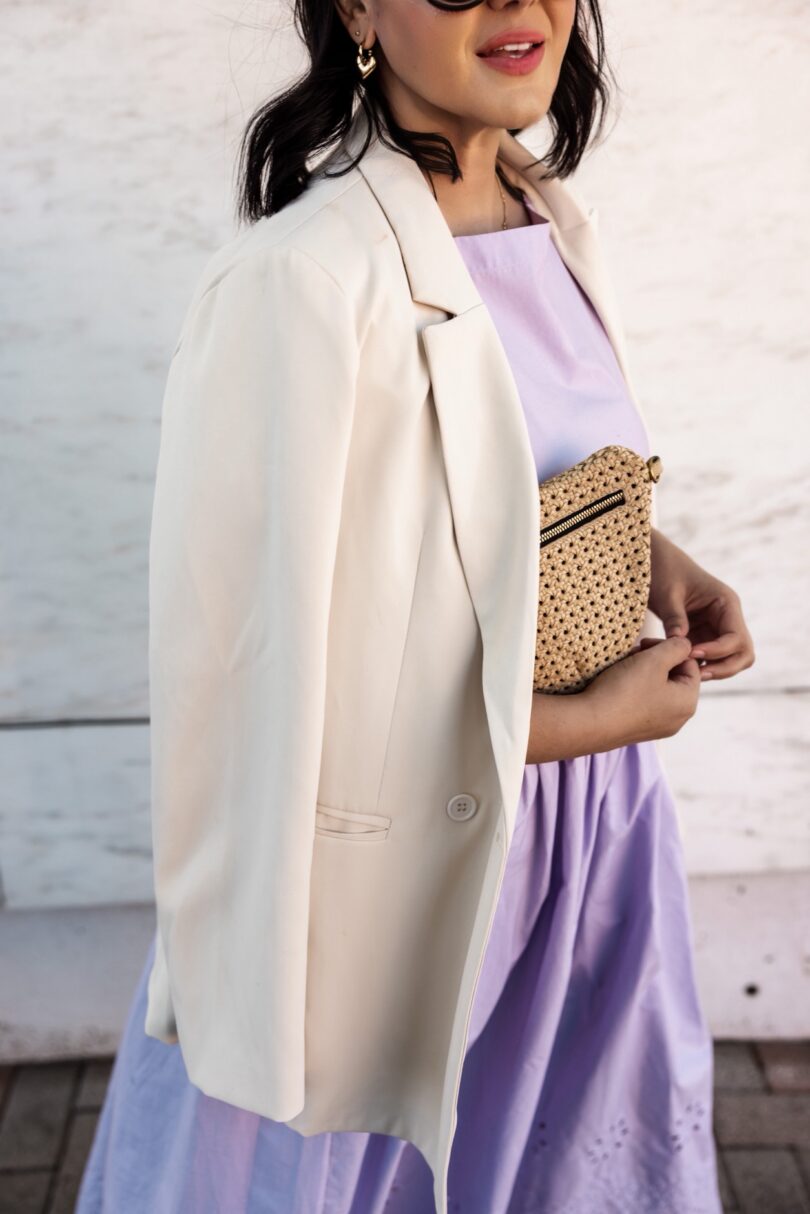 I’ve documented my outfits for the last 15 years online, so I basically have an unending catalog of outfits and ideas that I can reach into at any time. Some outfits are very repeatable even now, others are…well, lessons learned. The other day I was looking through some archives for my pre-loved shop and came across this post here. I remember loving this outfit — a flowy, colorful maxi dress and a black structured blazer, slight juxtaposition that worked really well. In theory it shouldn’t but on person it did. I cataloged it in my brain, I think because I was looking for a layer for this dress and the idea of an oversized blazer came to me. I remembered how much I loved that look and so I tried it with this one. The key, I realized was keeping the blazer on my shoulders, not worn on my body and that’s what creates the easy pairing here. If I put it on, it looks too oversized, but placed over my shoulders, it looks like an effortless but correct last minute addition.