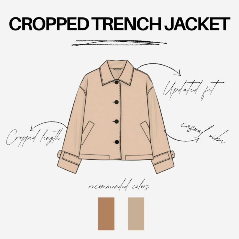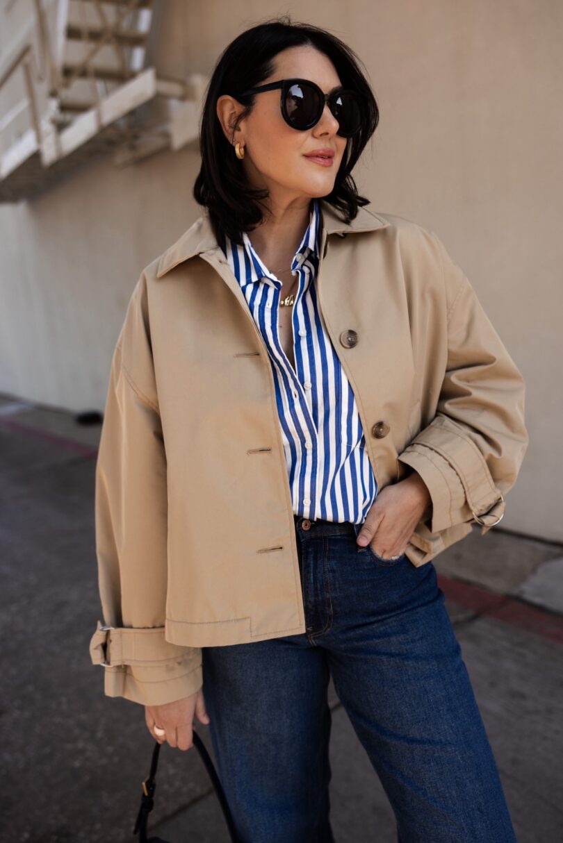The trench coat is one of fashion’s most enduring icons. But the cropped, oversized update is making waves right now. I like the cropped version for spring, it’s like taking a wardrobe classic but now it feels genuinely new. Plus the shorter length is inherently more casual, so all of the polish and none of the fuss with the belt, the length, etc. If you don’t need the extra coverage weather-wise, then the crop is the way to go.