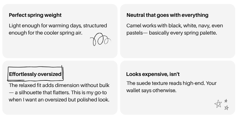 With its oversized silhouette and rich caramel suede-like fabric, this Amazon find literally makes everything look better. A simple sweater vest? Boom! Elevated. Basic white tee and jeans? Suddenly editorial. It’s the rare piece that delivers more than its price tag suggests, as it comes in just under $50.